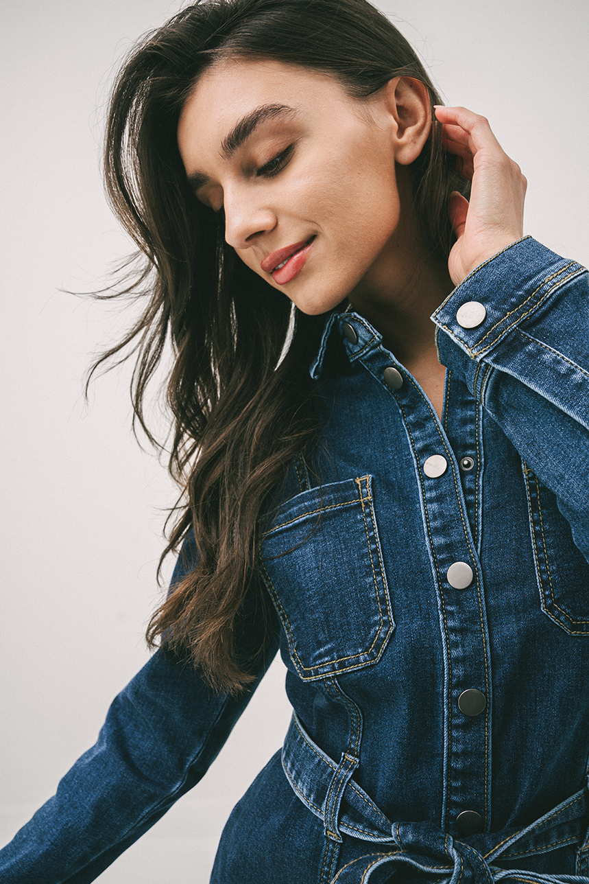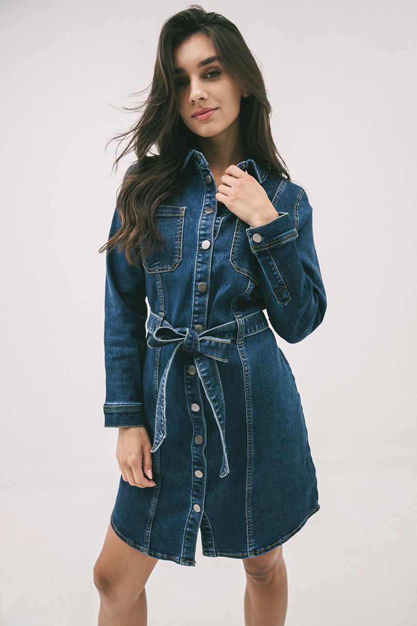 Polyvalente et flatteuse, la robe en denim col chemisier est une pièce essentielle au style affirmé. Sa coupe près du corps souligne la silhouette tout en offrant un confort optimal. Dotée d’un col chemisier classique et d’une longueur au genou, elle présente une boutonnière pleine longueur à l’avant, ainsi que deux poches appliquées à la poitrine pour une touche utilitaire. Les manches longues se ferment par boutons aux poignets pour un fini soigné. La ceinture à nouer, maintenue par quatre passants, permet de cintrer la taille selon vos envies. Une robe à la fois structurée et féminine.