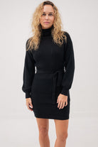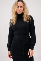 La robe en tricot noir ajustée allie confort et élégance avec sa coupe ajustée et son col roulé chic. Conçue dans une matière douce, confortable et extensible, elle présente de longues manches, une ceinture à la taille permettant de créer une boucle ou un nœud, ainsi que des bordures côtelées pour une touche de texture. Son ourlet droit et sa longueur au genou en font une pièce polyvalente, idéale pour un look raffiné au quotidien ou lors d’occasions spéciales.