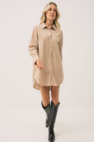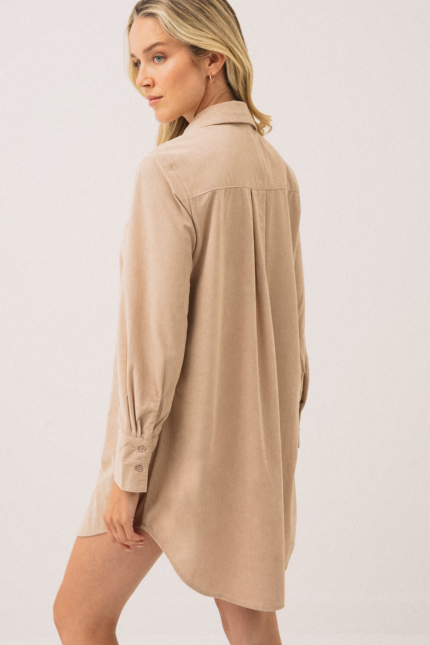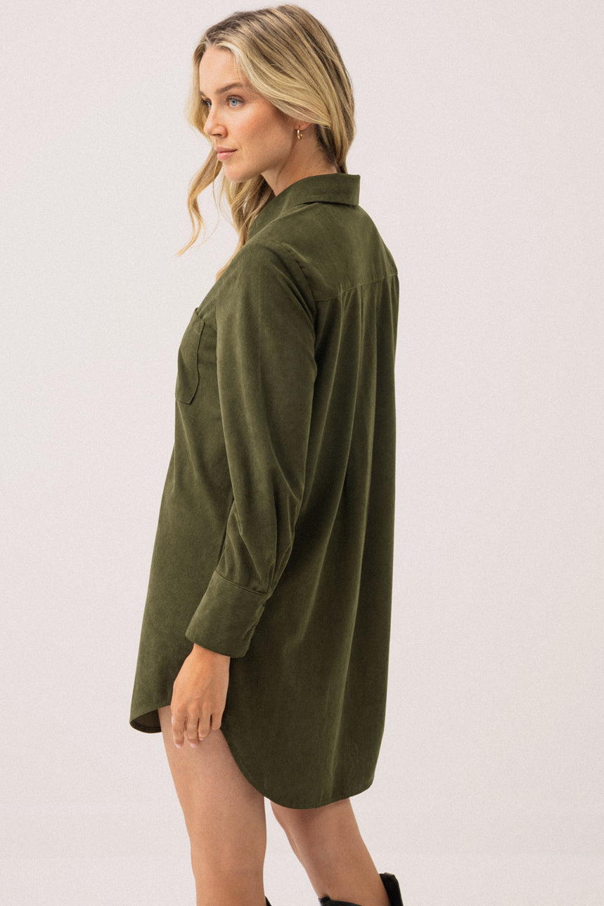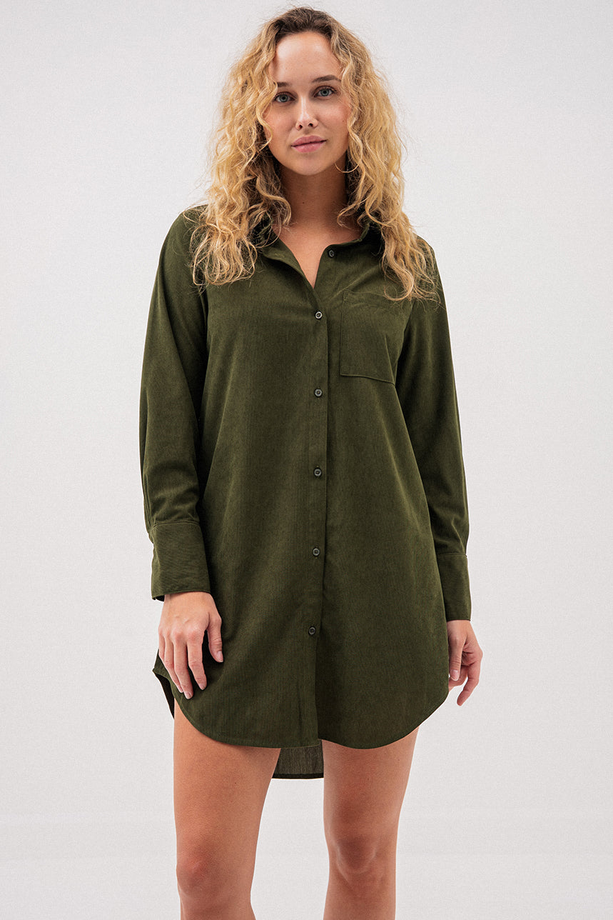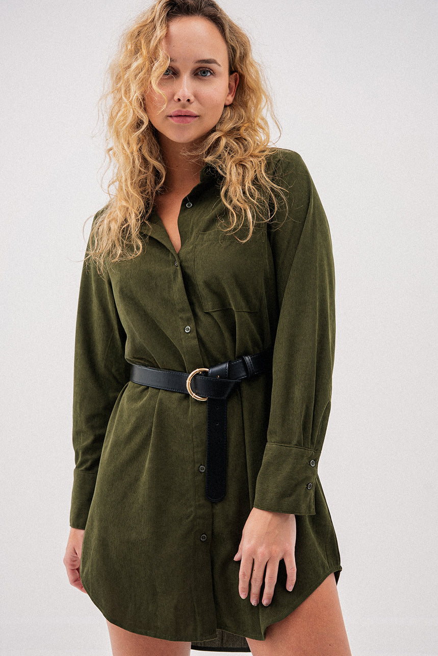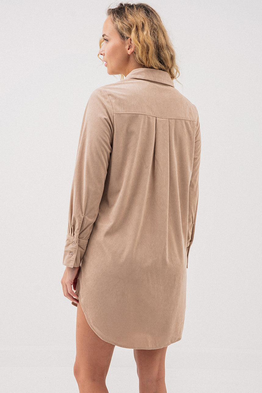 Ses manches longues avec fentes et boutons aux poignets ajoutent une touche soignée, tandis que la poche appliquée à la poitrine et le pli creux central au dos renforcent son style pratique et travaillé. L’ourlet arrondi et la longueur au genou créent une silhouette féminine et élégante. Confectionnée en velours côtelé doux et texturé, cette robe se distingue par son confort chaleureux et son charme authentique, parfaite pour la saison froide.