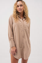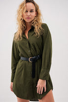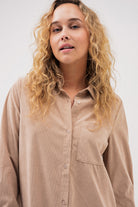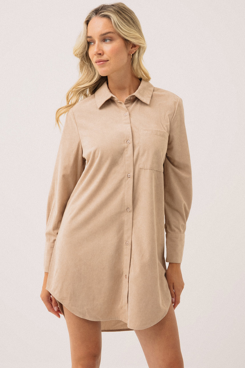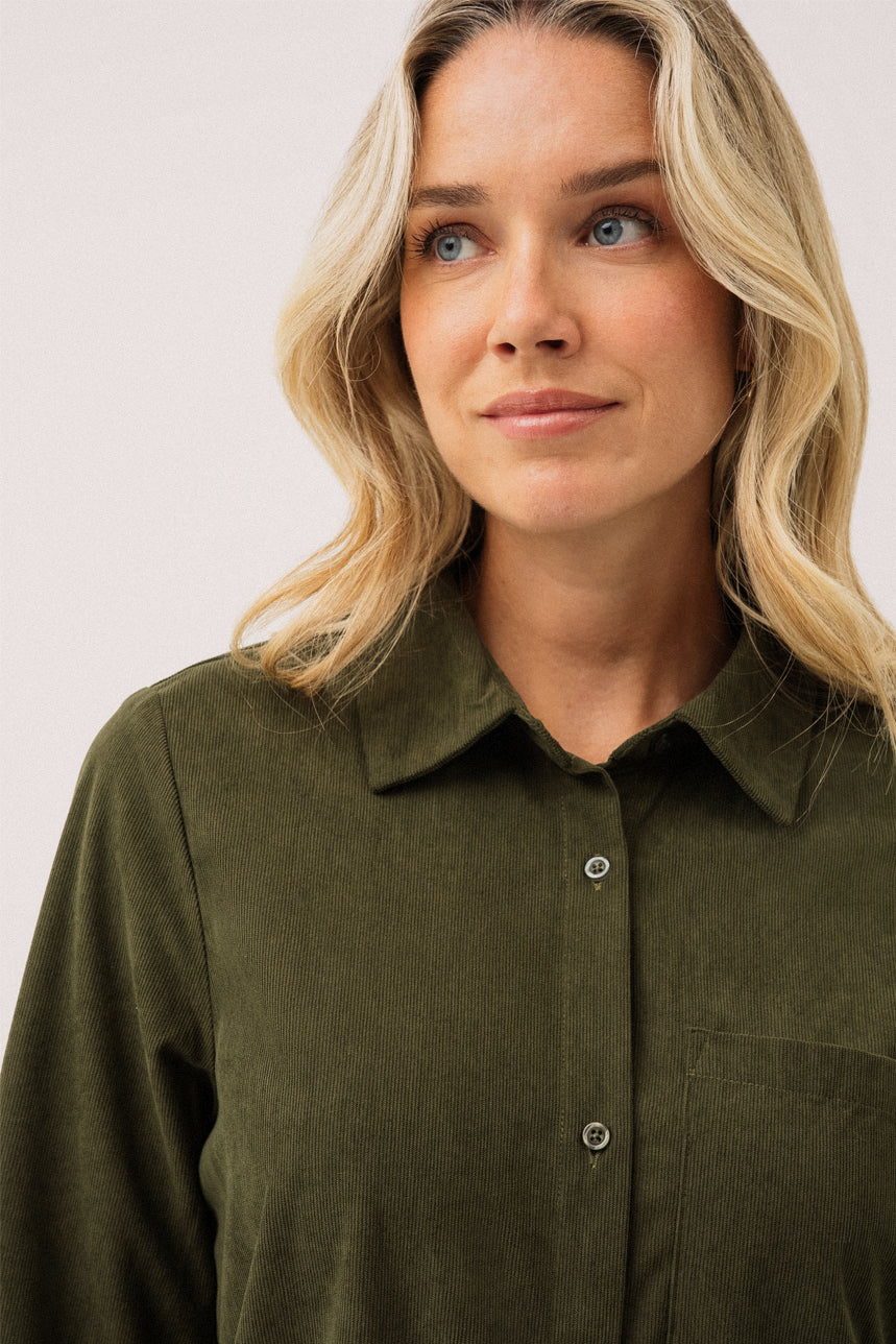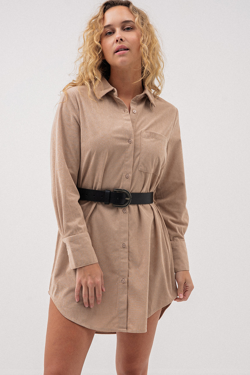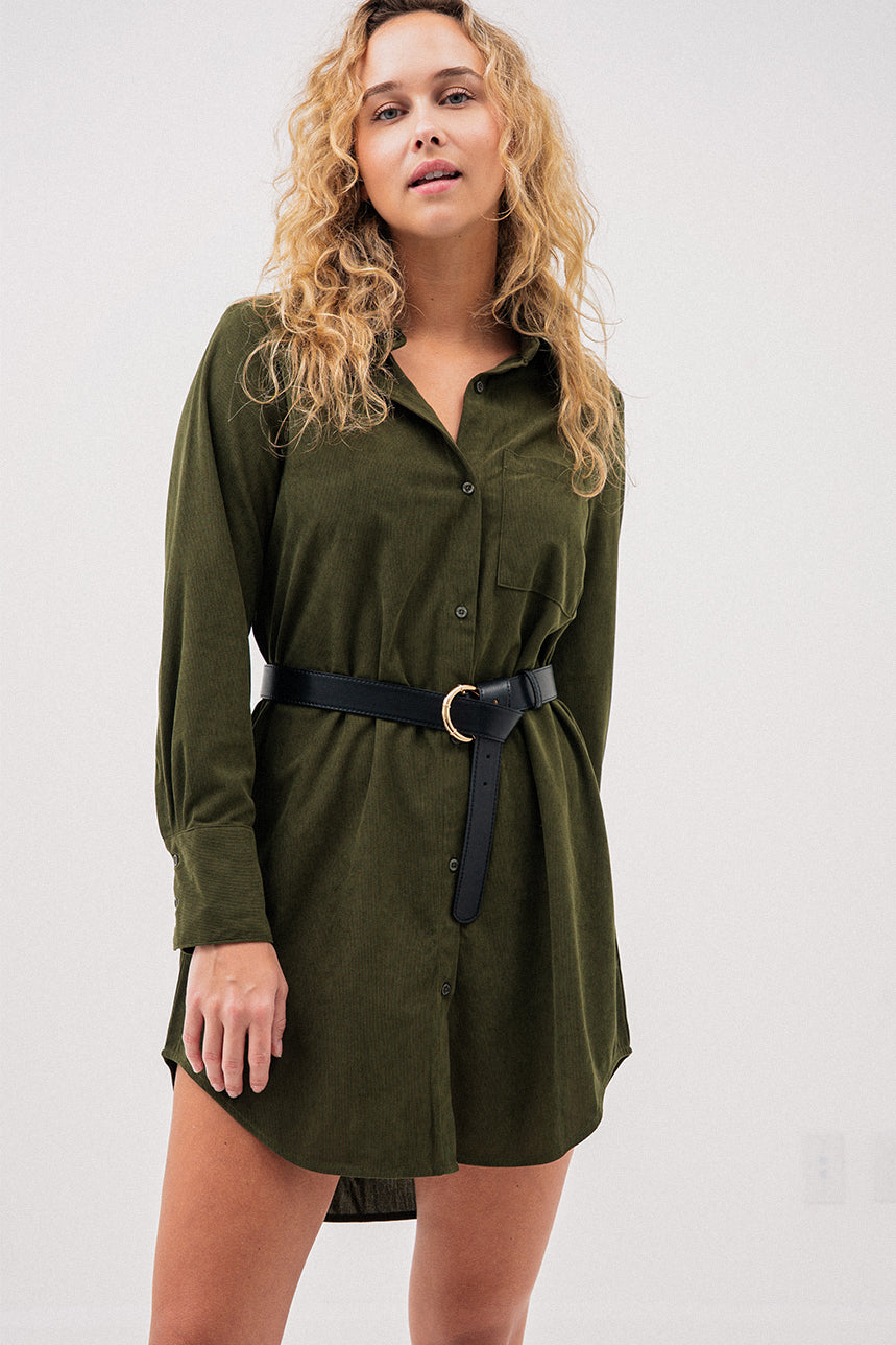 La robe chemisier en velours côtelé combine élégance et confort dans un style à la fois moderne et intemporel. Sa coupe chemisier légèrement ajustée épouse délicatement la silhouette tout en laissant une liberté de mouvement. Le col chemisier classique et la boutonnière pleine longueur lui confèrent une allure raffinée et polyvalente, idéale autant pour un look professionnel que décontracté.