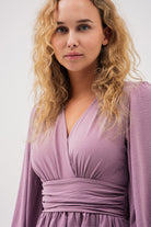 La robe lavande cintrée à la taille séduit par sa coupe féminine soulignée d’une taille élastique avec détail nid d’abeille au dos, qui assure confort et ajustement. Son col en V plongeant met en valeur le décolleté tandis que ses manches longues bouffantes ajoutent du volume et de l’élégance. Confectionnée dans un tissu léger et fluide, elle présente un ourlet droit et une longueur au genou, idéale pour une allure chic et gracieuse.
