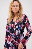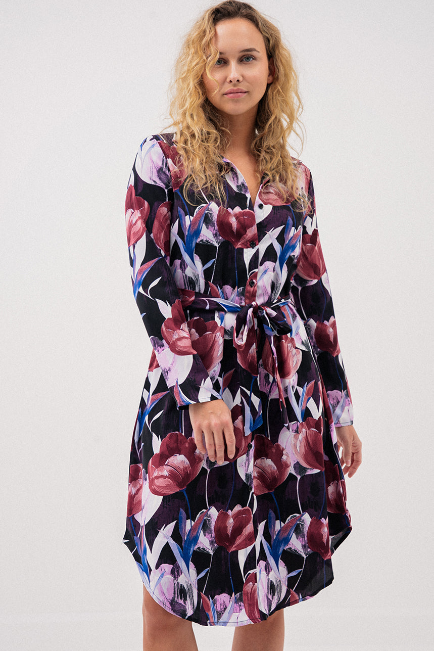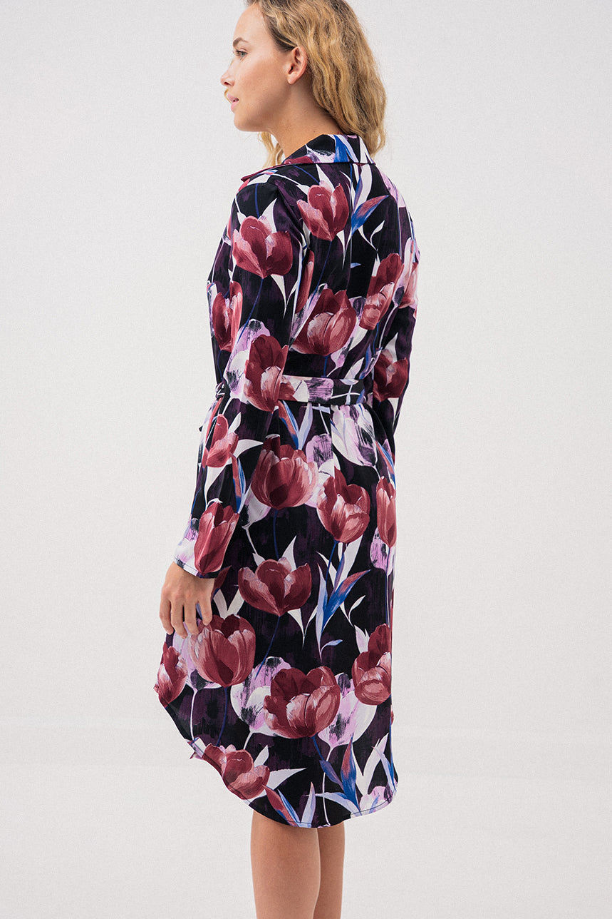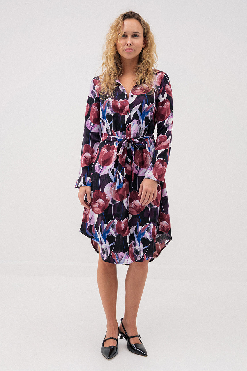 La robe midi fleurie présente une coupe près du corps qui met en valeur la silhouette. Son col chemisier ouvert et sa boutonnière pleine longueur apportent une touche élégante. Dotée de manches longues et d’une ceinture à la taille à nouer en boucle ou en nœud, elle assure un ajustement personnalisé. Son ourlet arrondi et sa longueur midi offrent un style féminin et raffiné.