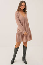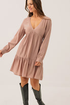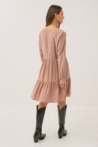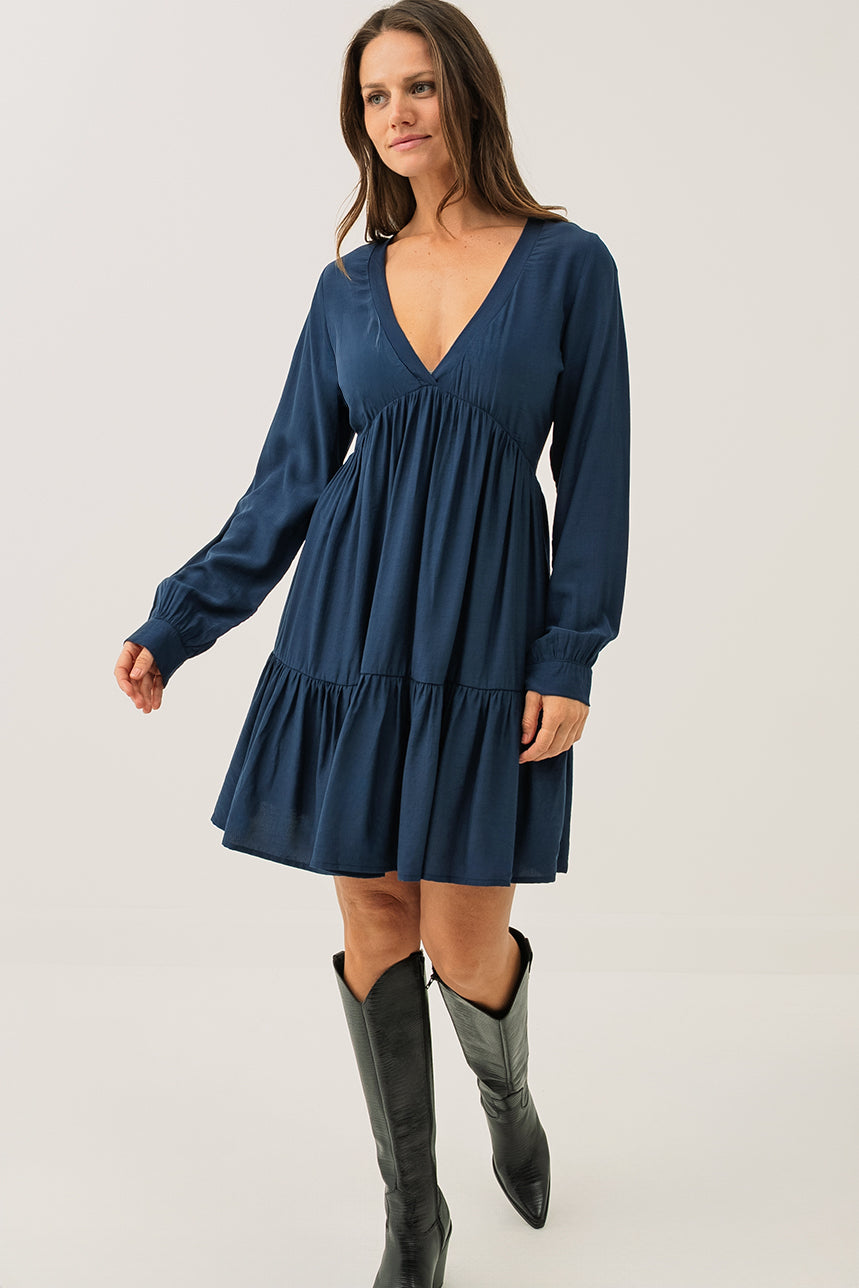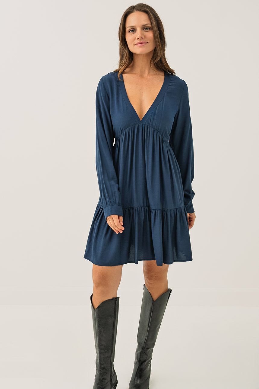 La robe marine à jupe étagée séduit par sa coupe ligne A ample et fluide, qui assure un tombé gracieux et un confort optimal. Son col en V met délicatement le haut du buste en valeur, tandis que les manches longues de style bishop apportent une touche féminine et romantique. La jupe à deux étages froncés crée un joli volume et un mouvement léger à chaque pas. Confectionnée dans un tissu doux et aérien, cette robe d’une longueur au genou allie élégance décontractée et raffinement intemporel.