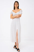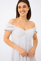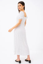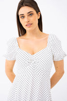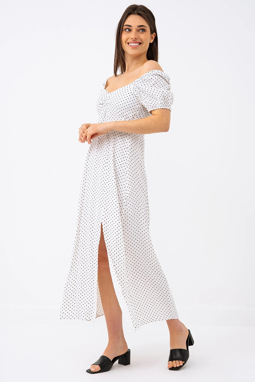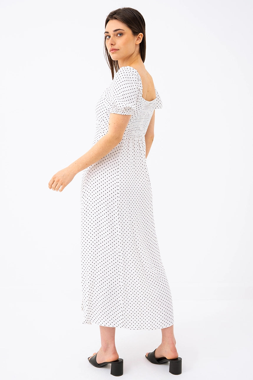 Adoptez un look romantique et intemporel avec cette robe longue à pois, parfaite pour toutes les occasions. Son haut ajusté et son bas évasé mettent en valeur la silhouette tout en offrant un confort fluide et aérien. Son col cœur avec fronces sublime le décolleté avec délicatesse, tandis que ses manches courtes bouffantes ajoutent une touche de charme vintage.