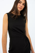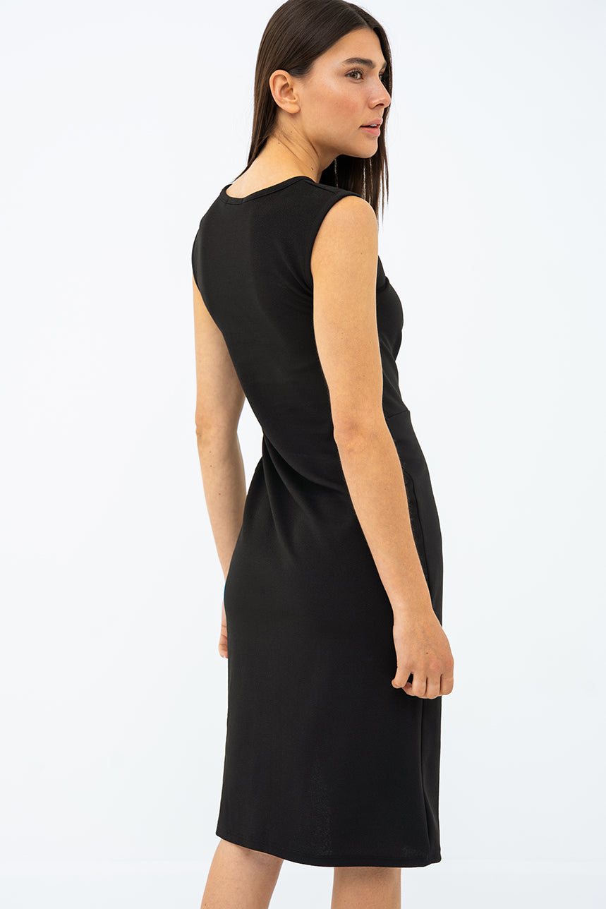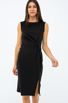 Élégante et flatteuse, la robe midi à nœud à la taille met en valeur la silhouette avec sa coupe ajustée et son nœud froncé à la taille qui crée un effet drapé raffiné. Son col rond et son design sans manches lui confèrent une allure épurée, idéale pour les journées chaudes ou les événements estivaux. La longueur midi et la fente latérale ajoutent une touche de fluidité et de féminité. Confectionnée dans une matière texturée, extensible et confortable, cette robe allie style et aisance avec élégance.