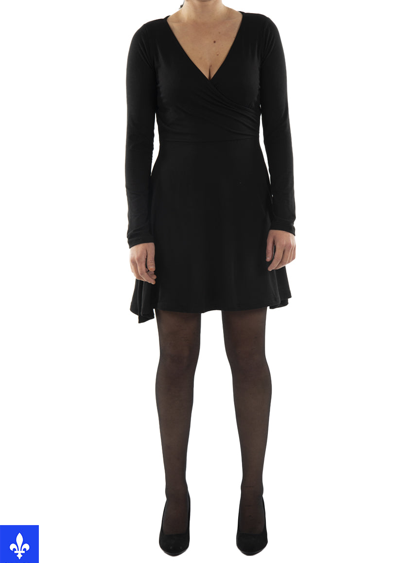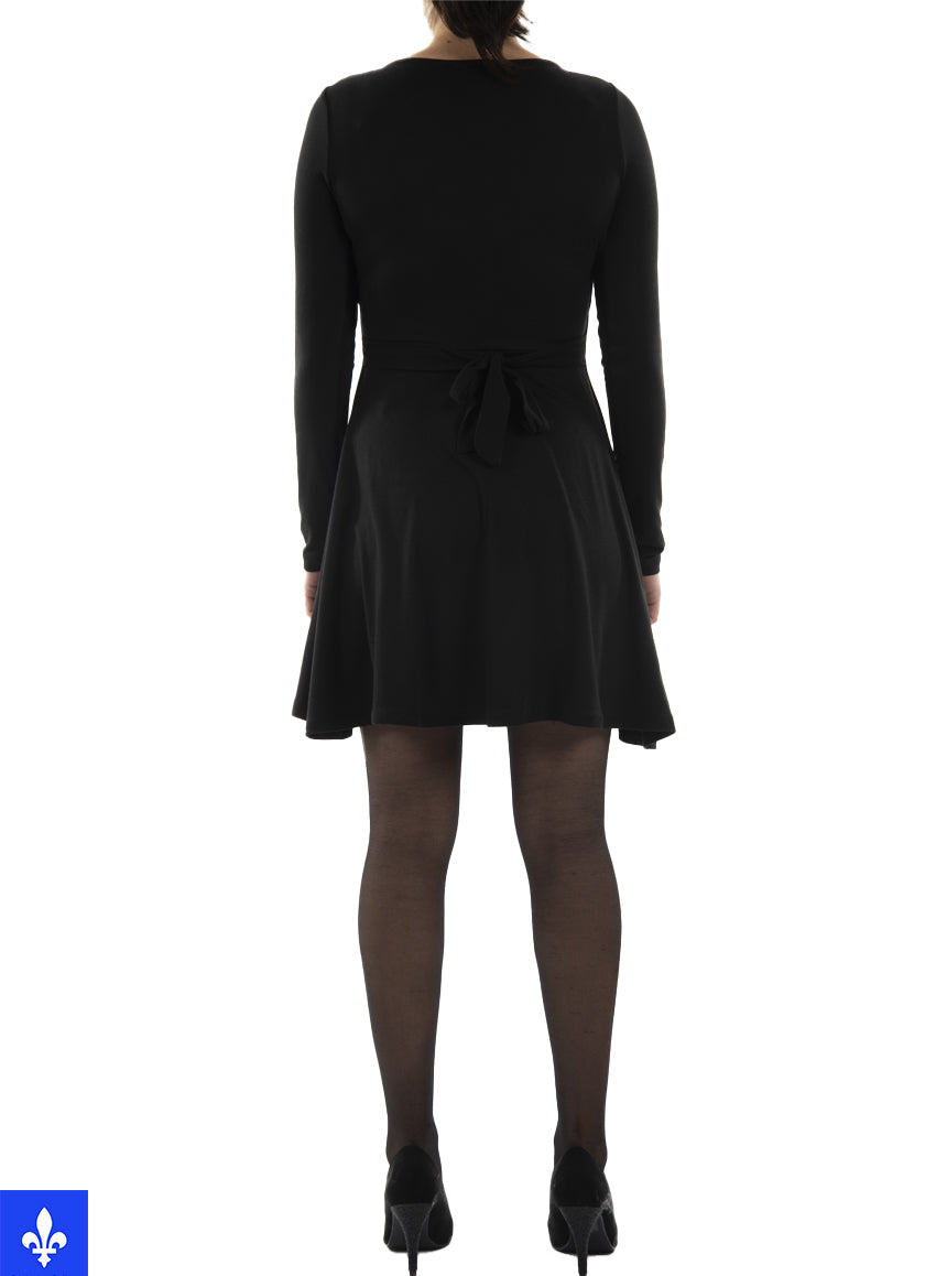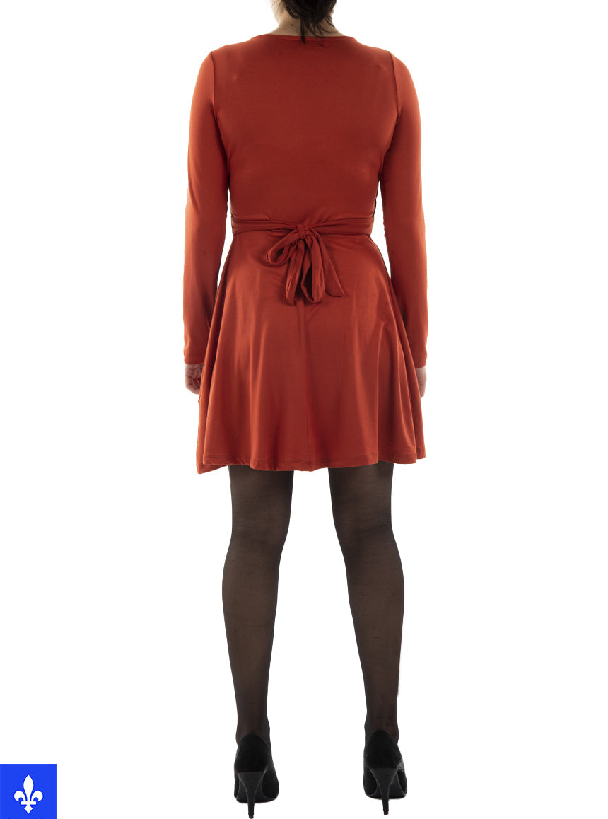 Robe Pentagone à encolure croisée et manches longues. Ligne A au niveau de la taille et cordon d'ajustement au dos.