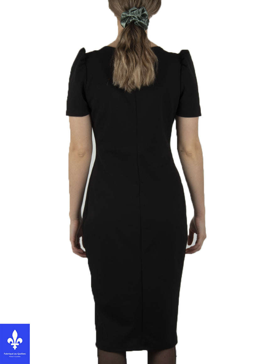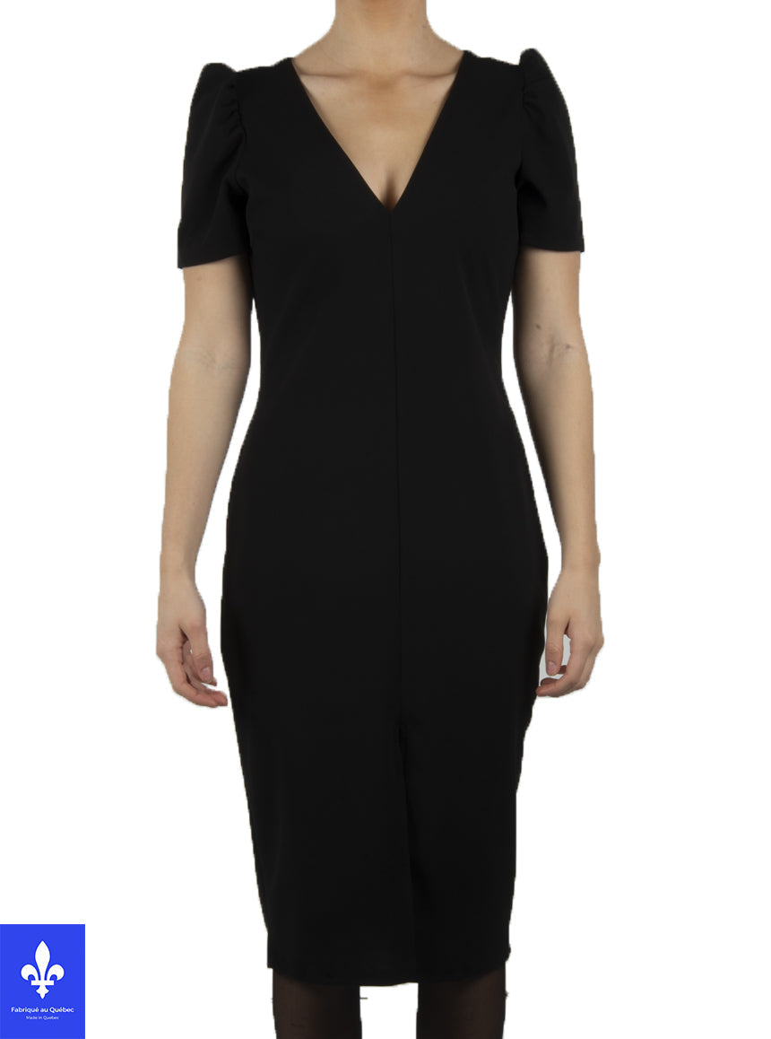 Robe habillée midi, col en V. Effet épaulettes au niveau des épaules.