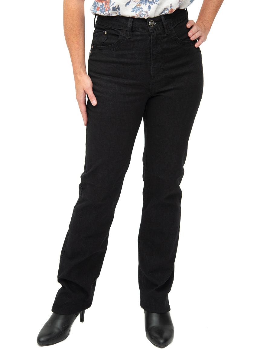 Coupe de jeans Pentagone à jambe droite et à taille haute, curvy. Le jeans noir idéal pour la femme qui désire un denim confortable tout en valorisant sa silhouette. S'agence très bien avec tous les hauts.