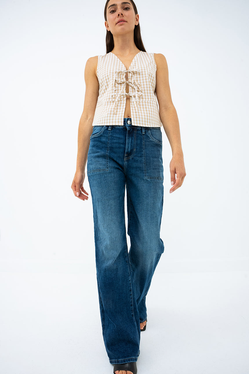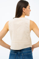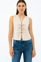 À la fois audacieuse et féminine, la camisole à carreaux avec attache à boucles se démarque par son style rétro revisité. Sa coupe cintrée et son col en V mettent en valeur la silhouette, tandis que les trois boucles décoratives à l’avant ajoutent une touche d’originalité. Sans manches et confectionnée dans une matière légère et confortable, elle est parfaite pour les journées ensoleillées ou superposée sous une veste légère pour un look plein de caractère.