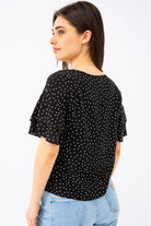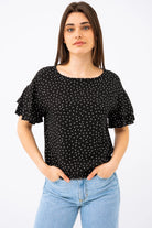 Avec son motif à pois intemporel et sa coupe ample, cette blouse est une pièce à la fois élégante et aérienne. Son col bateau met délicatement en valeur les épaules, tandis que les manches courtes ornées de deux étages de volants apportent une touche de féminité et de mouvement. Confectionnée dans un tissu fluide et léger, elle offre un confort optimal tout au long de la journée.