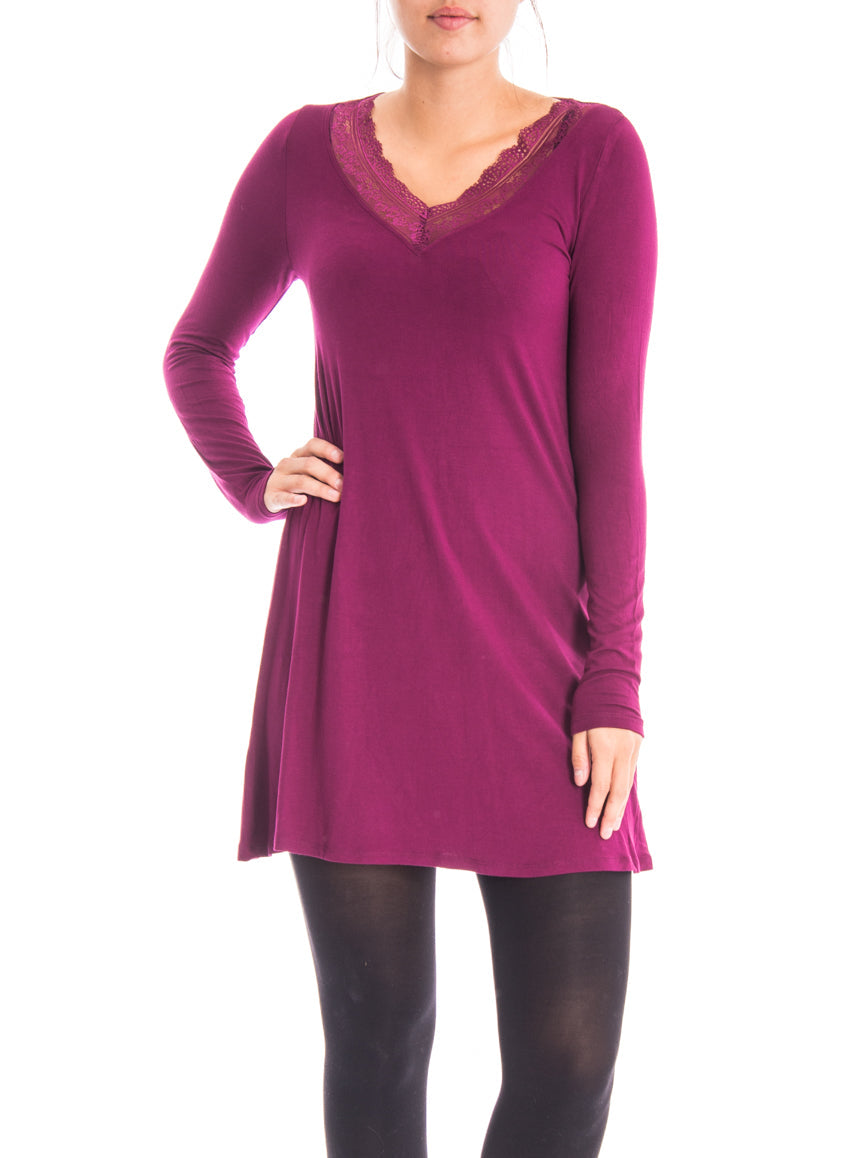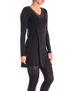 Petite robe fluide Pentagone à manches longues et col en V. Détail de dentelle à l'encolure.