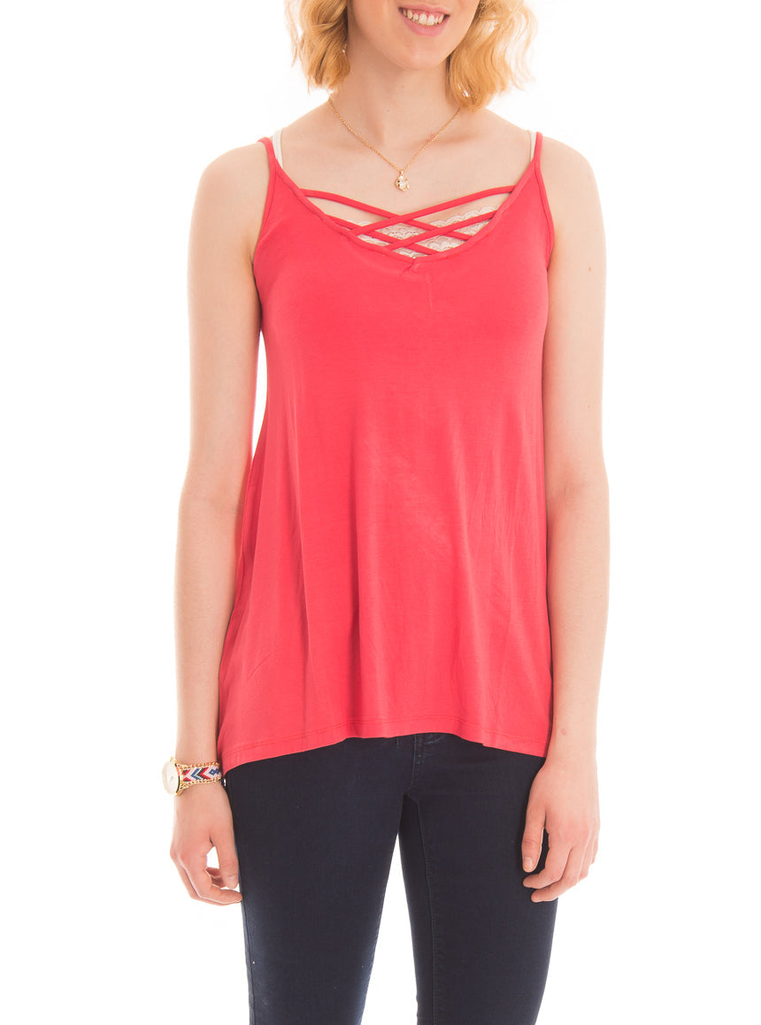 Camisole Pentagone ample à encolure croisée et à fines bretelles. Se porte très bien avec un legging ou un pantalon pull-on.