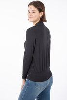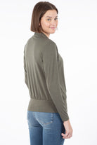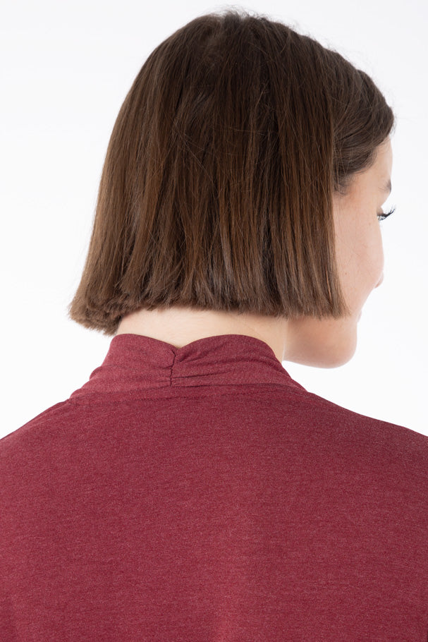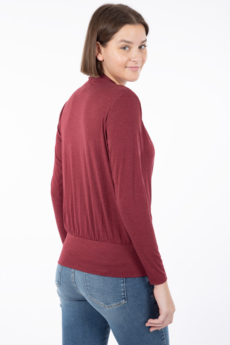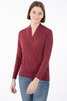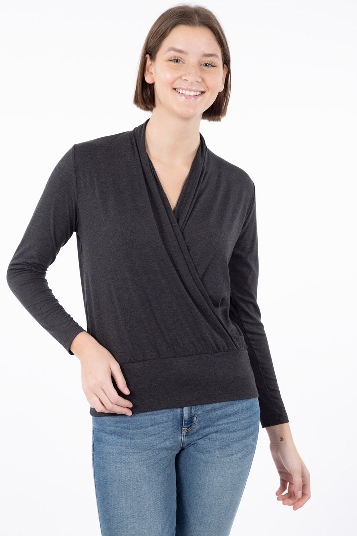 T-shirt uni manches longues pour femme de la collection Pentagone. Encolure croisée plongeante. Bande élastique à la taille. Agencez ce t-shirt pour femme versatile avec un pantalon, un jean ou une jupe. Portez le seul ou sur une camisole selon vos envies.
