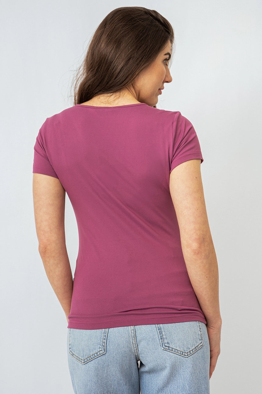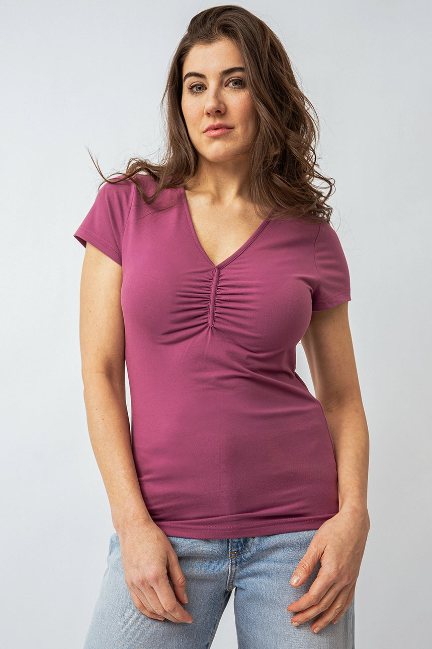 Mettez en valeur votre silhouette avec ce t-shirt col en V froncé, alliant élégance et confort. Sa coupe ajustée sublime la silhouette, tandis que les fronces au col apportent une touche féminine et raffinée. Confectionné dans une matière douce, extensible et confortable, il est parfait pour une tenue à la fois chic et décontractée.