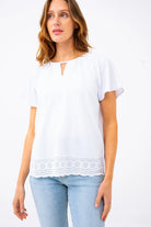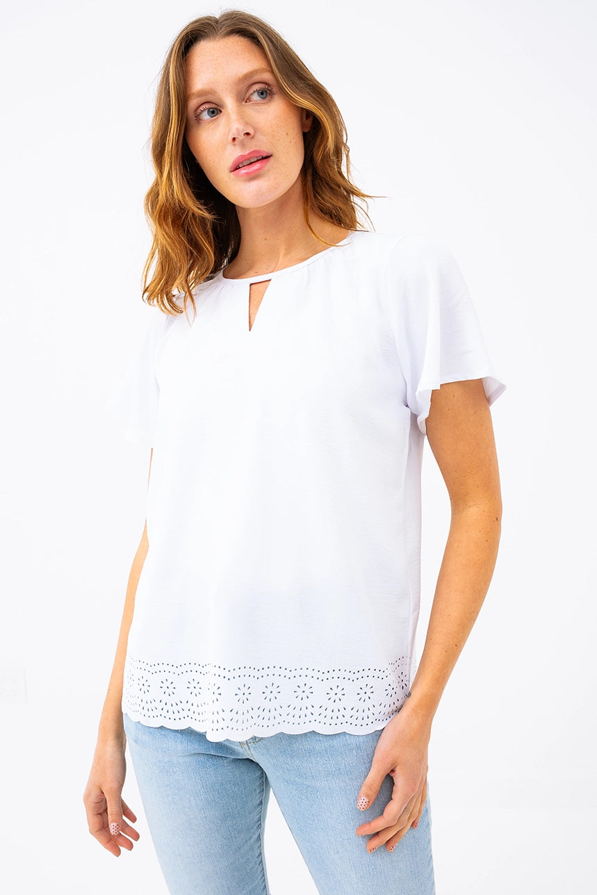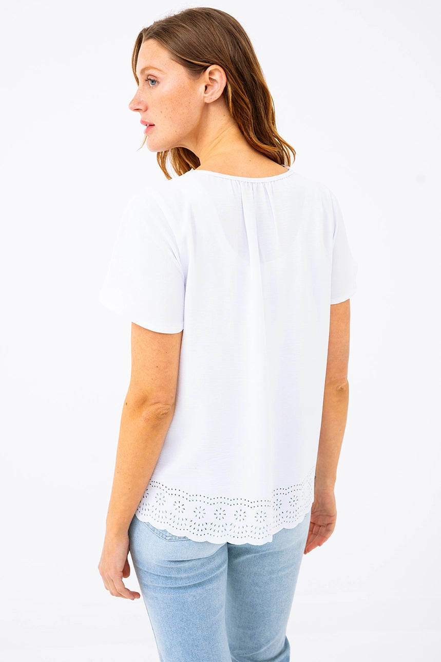 Léger et plein de charme, le t-shirt ample à finition découpée est la pièce parfaite pour un look décontracté et féminin. Sa coupe ample et sa matière fluide offrent un confort aérien, tandis que le col rond avec ouverture en V et fronces apporte une touche de délicatesse. Les manches courtes à volants ajoutent du mouvement, et la découpe détaillée dans le bas vient rehausser l’ensemble d’un fini raffiné. Un essentiel facile à agencer, idéal pour les journées en toute légèreté.