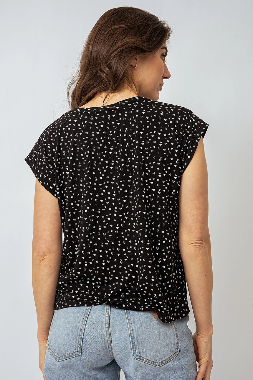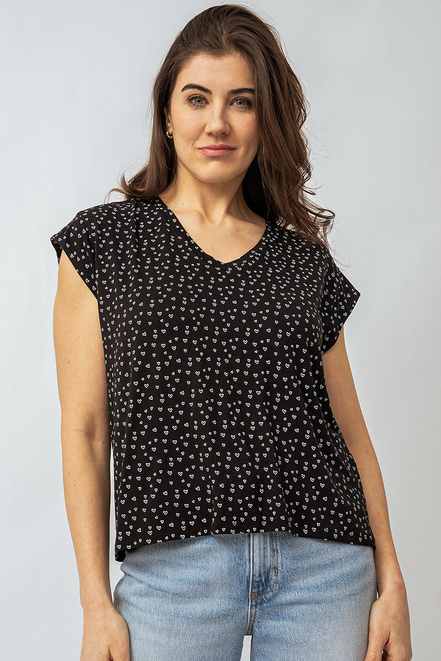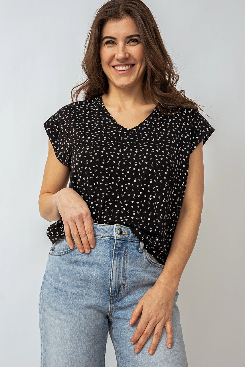 Ajoutez une touche de douceur à votre style avec le t-shirt imprimé petits cœurs ❤️. Sa coupe ample, son col en V et ses manches courtes offrent un confort absolu tout en apportant une silhouette fluide et féminine. Confectionné dans une matière douce et extensible, il est parfait pour un look à la fois décontracté et charmant.