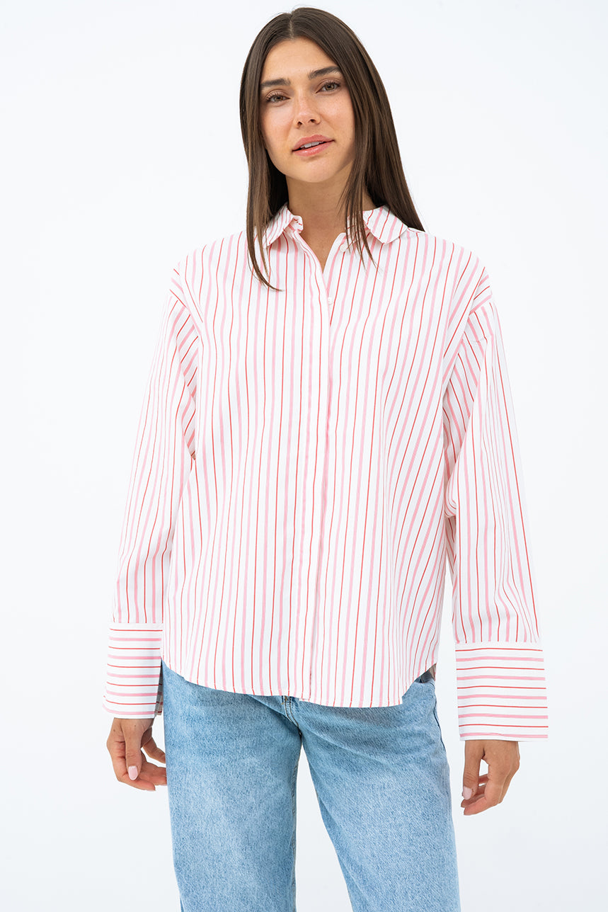 Classique avec une touche moderne, la blouse en popeline à rayures Caro de JJXX est conçue pour un look à la fois décontracté et raffiné. Sa coupe ample, son col chemisier et ses manches longues à poignets droits fermés par deux boutons en font une pièce polyvalente, parfaite du bureau à la fin de semaine. La boutonnière pleine longueur avec patte de boutonnage cachée renforce son style épuré, tandis que sa matière fluide et légère assure un confort optimal tout au long de la journée.