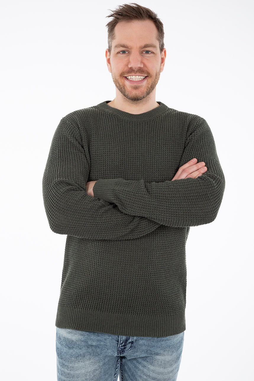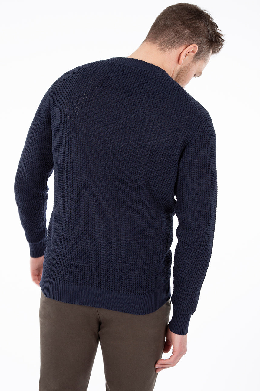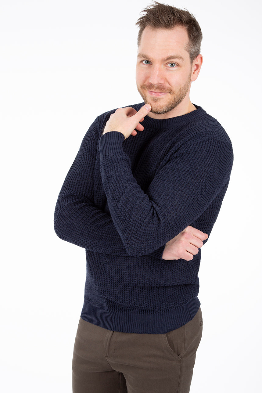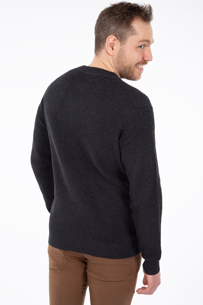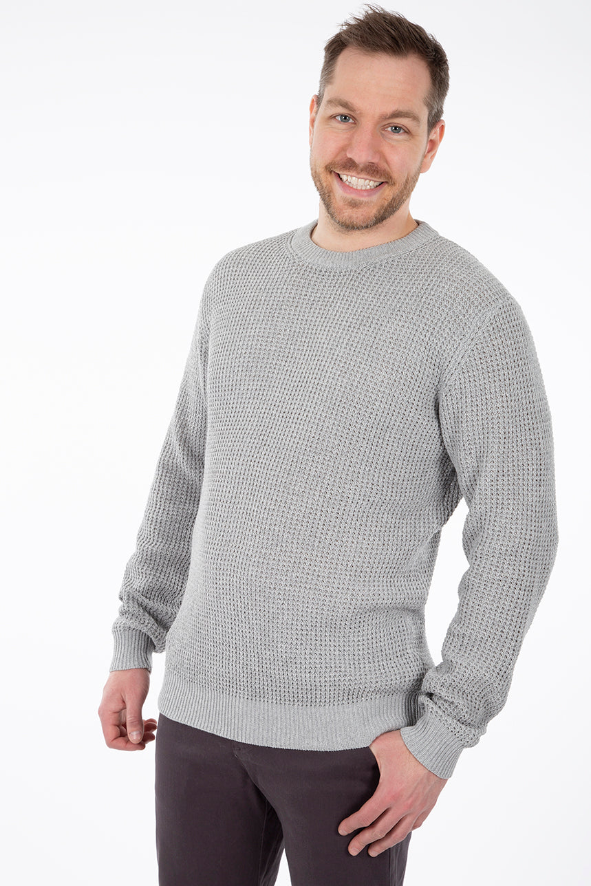 Chandail col rond, à manches longues, pour homme. Tricot de coton recyclé, léger et extensible. Disponible en 4 couleurs neutres et tendance. Ce chandail, pour homme, tout-aller s'agencera parfaitement à tous vos jeans.