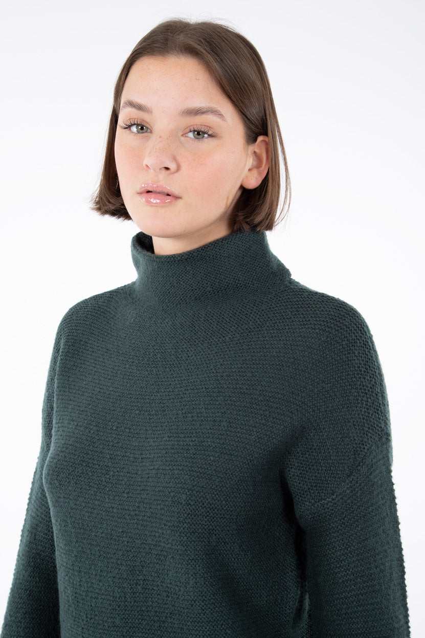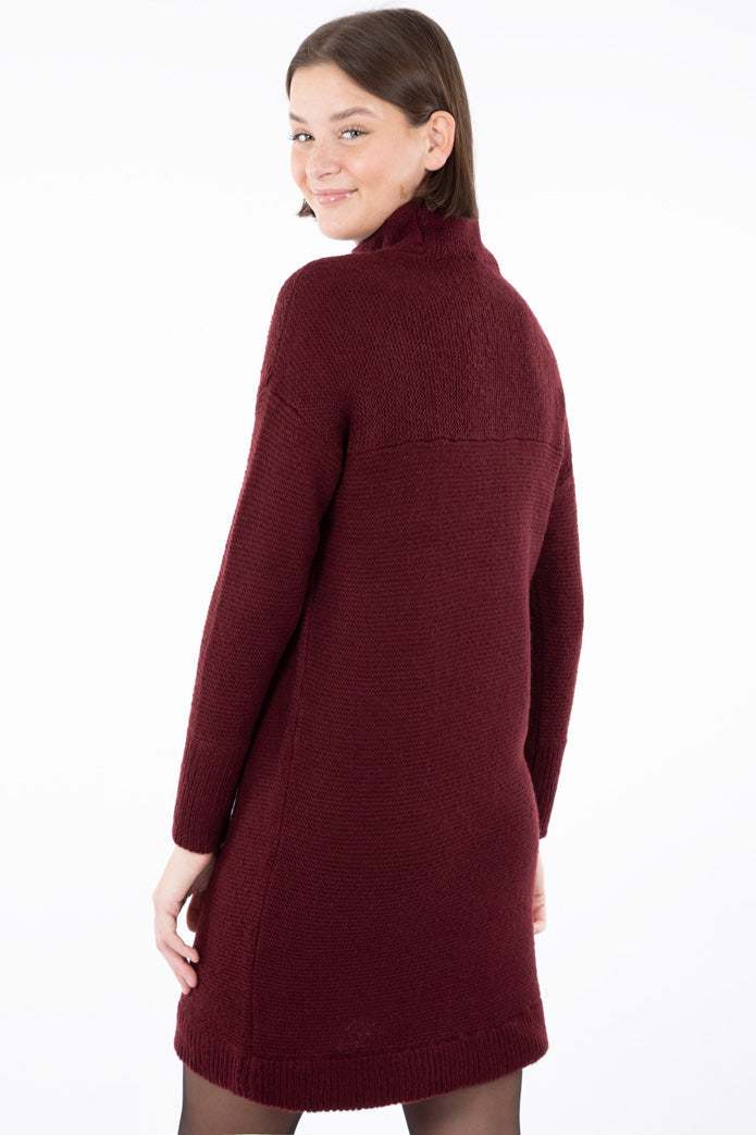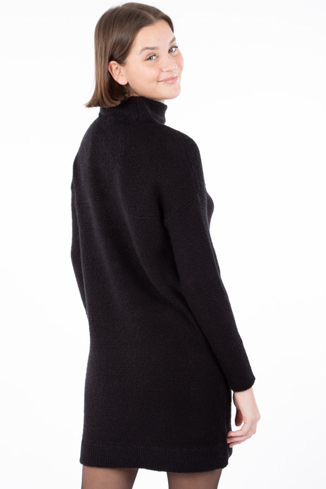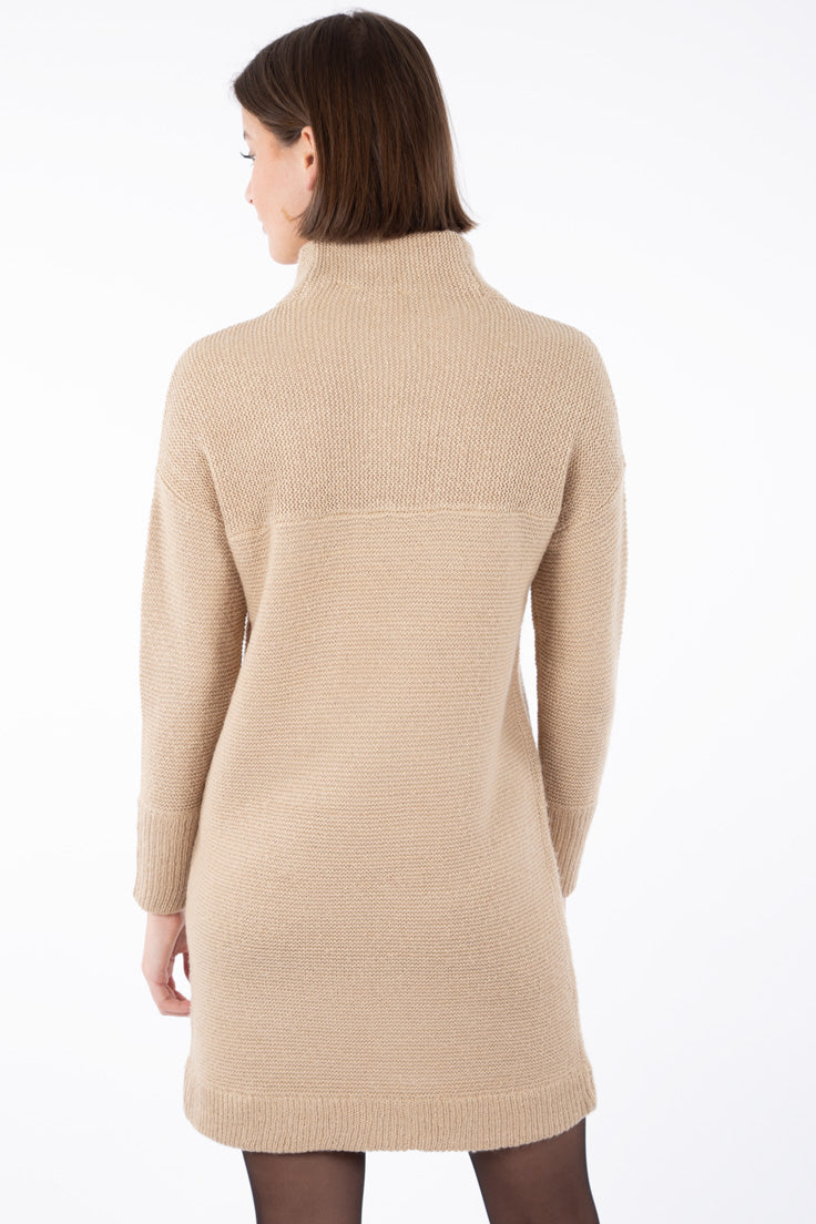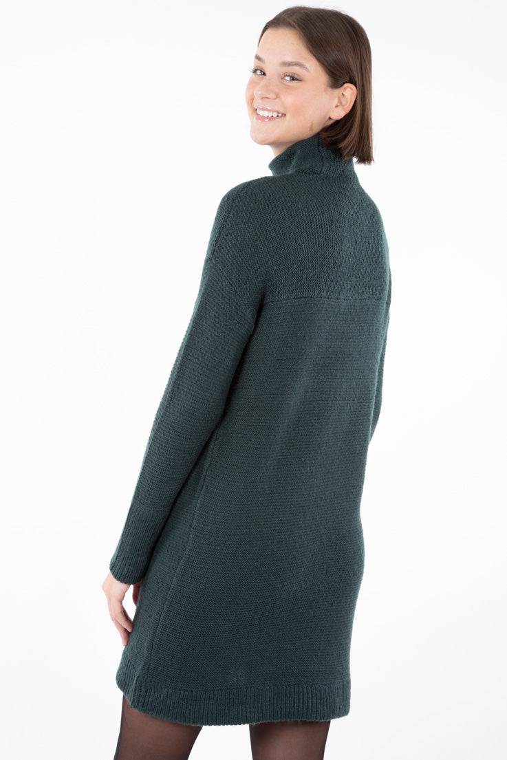 Robe en tricot, col montant, pour femme de longueur mi-cuisse. On aime son tissu doux et léger ainsi que sa longueur parfaite qui vous procure le confort idéal dans tous vos mouvements. Col et bordures côtelées. Cette robe douillette pour femme se porte aisément comme tenue tout-aller mais également avec un legging. Sortez vos espadrilles, vos bottes ou vos talons. Cette robe s'agence avec tout.