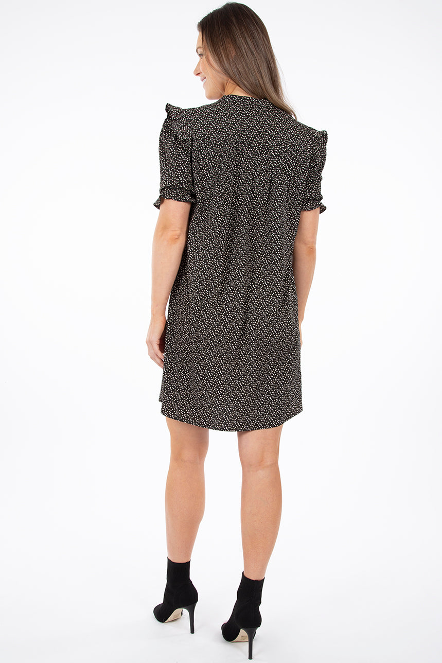 Robe à manches courtes pour femme, de la collection Pentagone Premium. Joli imprimé de petites fleurs blanches. Col rond avec fente. Volant aux épaules. Osez la robe ample pour femme. Portez-la avec une ceinture pour la cintrer ou laisser la lousse pour un look contemporain.