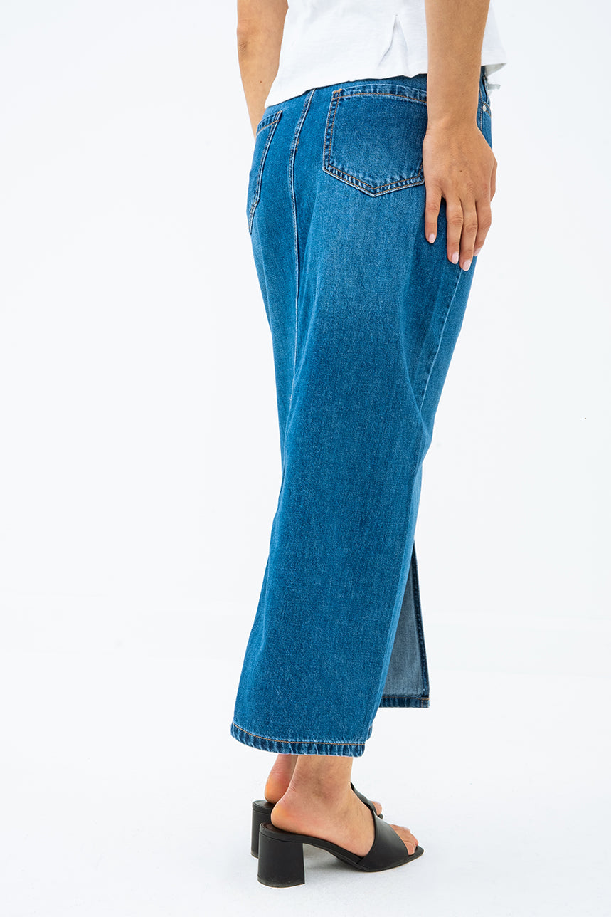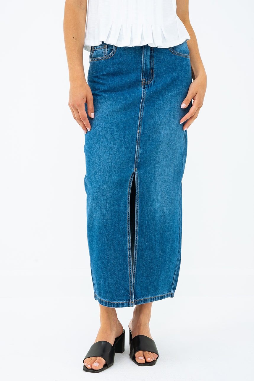Classique revisitée, la jupe longue en denim allie confort et style intemporel. Dotée d’une coupe 5 poches, d’une fermeture éclair avec bouton à l’avant et de passants de ceinture, elle offre une silhouette structurée et pratique. Sa longue fente à l’avant apporte une touche féminine et facilite le mouvement, faisant de cette jupe un choix parfait pour un look décontracté mais soigné.
