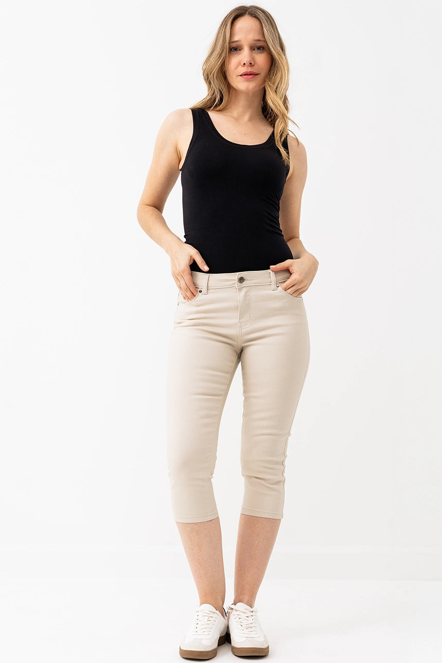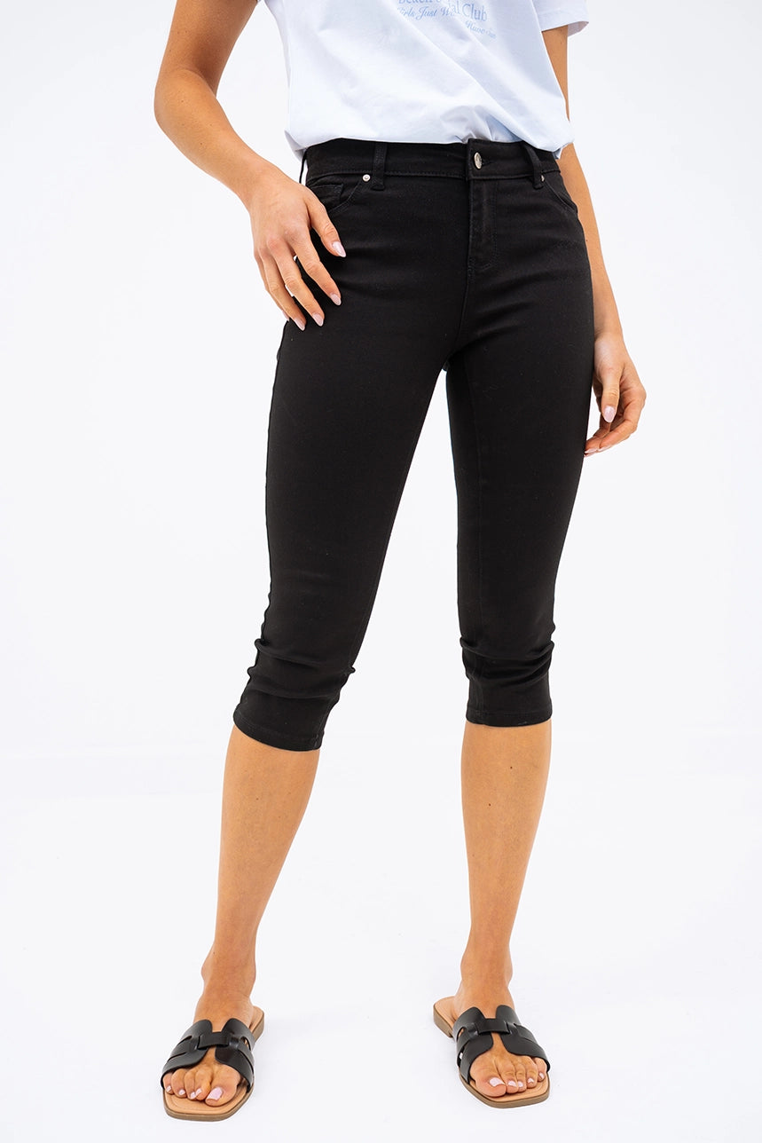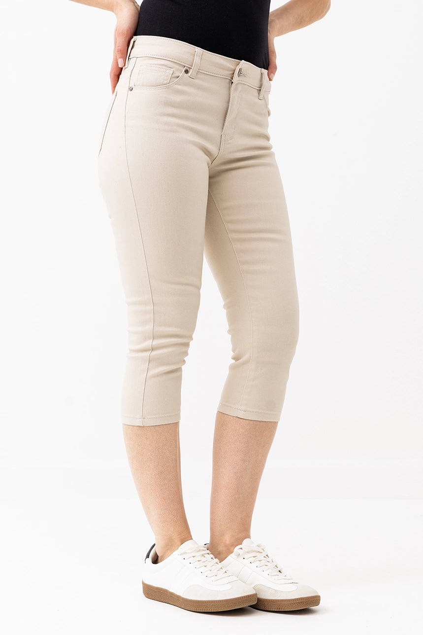 Ce capri offre une taille régulière, une coupe 5 poches et une fermeture à glissière avec bouton à l’avant, pour un look classique et flatteur. Sa matière extensible assure confort et effet sculptant tout au long de la journée.