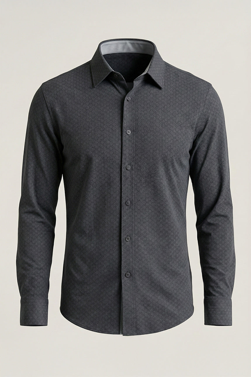 Cette chemise à motif noire adopte une coupe régulière et offre un confort optimal grâce à son tissu hyper extensible, facile d’entretien et résistant au froissement. Son col italien, sa boutonnière pleine longueur et ses poignets biseautés à revers contrasté ajoutent une touche raffinée. Dotée de plis d’aisance au dos et d’un ourlet arrondi, elle assure une liberté de mouvement et une silhouette soignée.