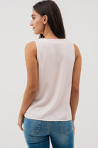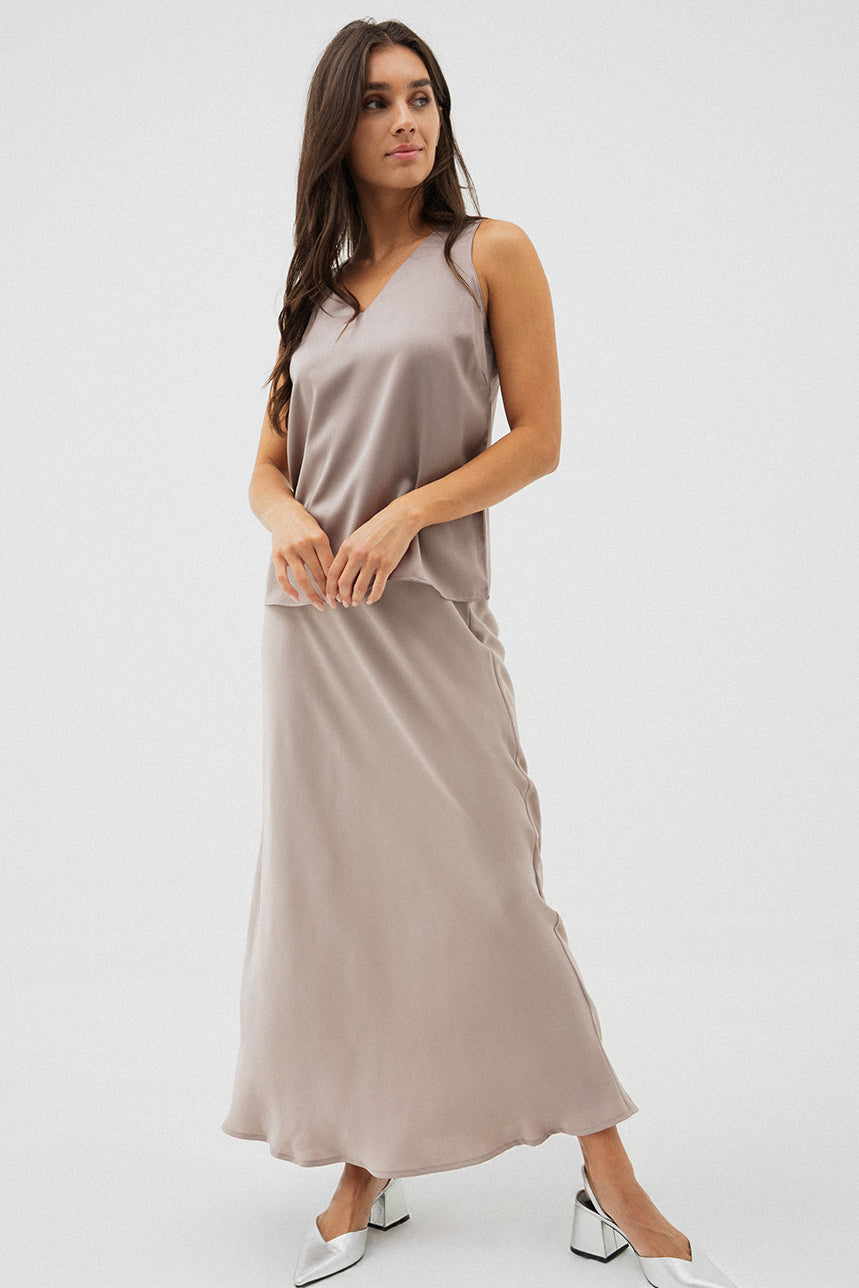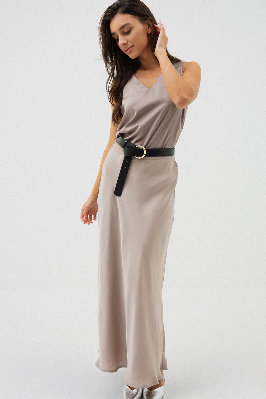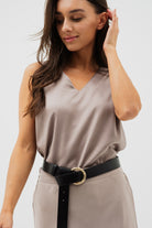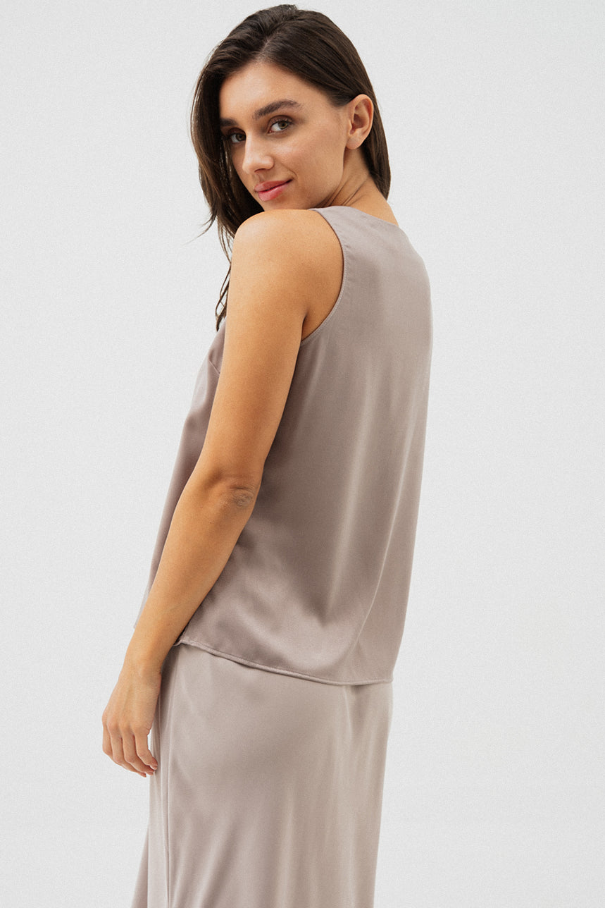 La camisole en satin se distingue par sa coupe ample et fluide qui offre confort et élégance. Son col en V délicat met subtilement en valeur le décolleté, tandis que son ourlet droit assure une finition soignée. Confectionnée dans une matière satinée légèrement texturée, elle combine brillance discrète et raffinement, idéale à porter seule pour un look chic et minimaliste ou en superposition sous un veston pour une allure sophistiquée.