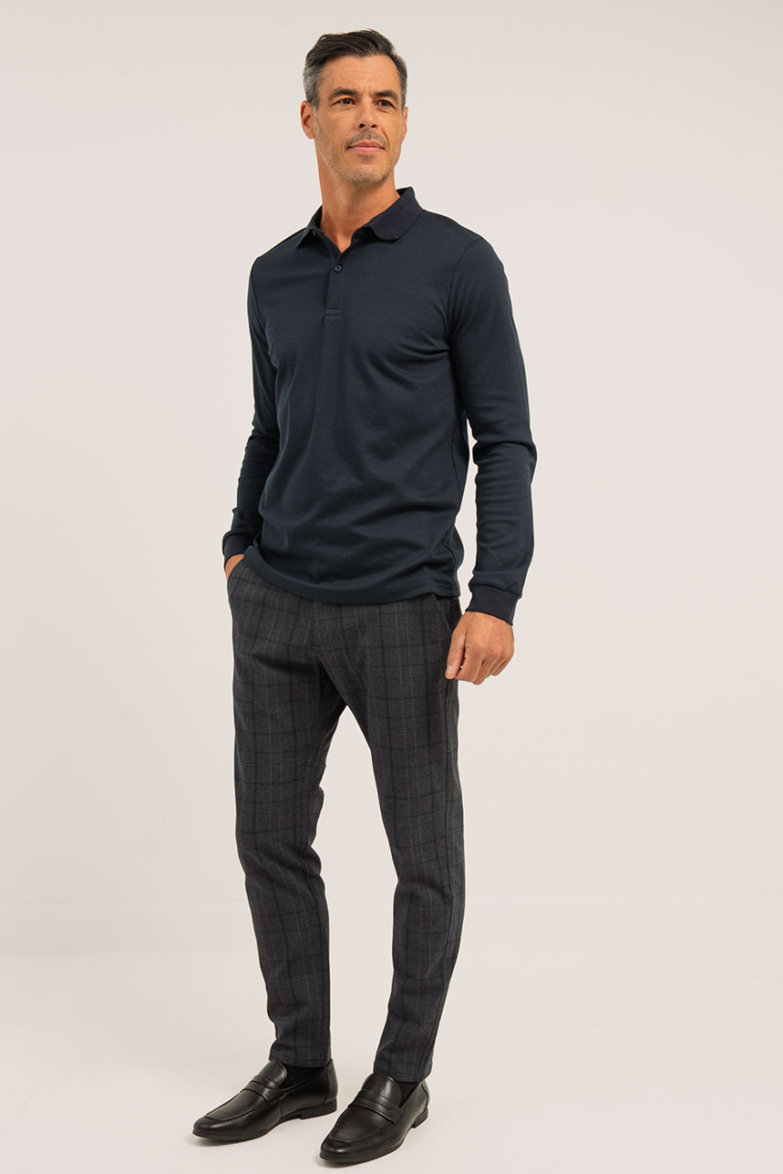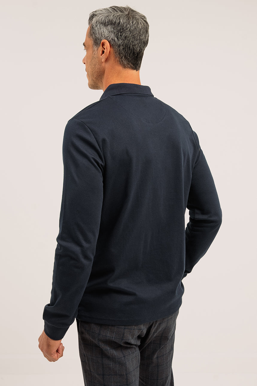 Le polo marine à manches longues présente une coupe semi-ajustée avec une encolure polo à deux boutons. Ses manches longues et son tissu extensible offrent un confort agréable et une allure décontractée mais soignée.