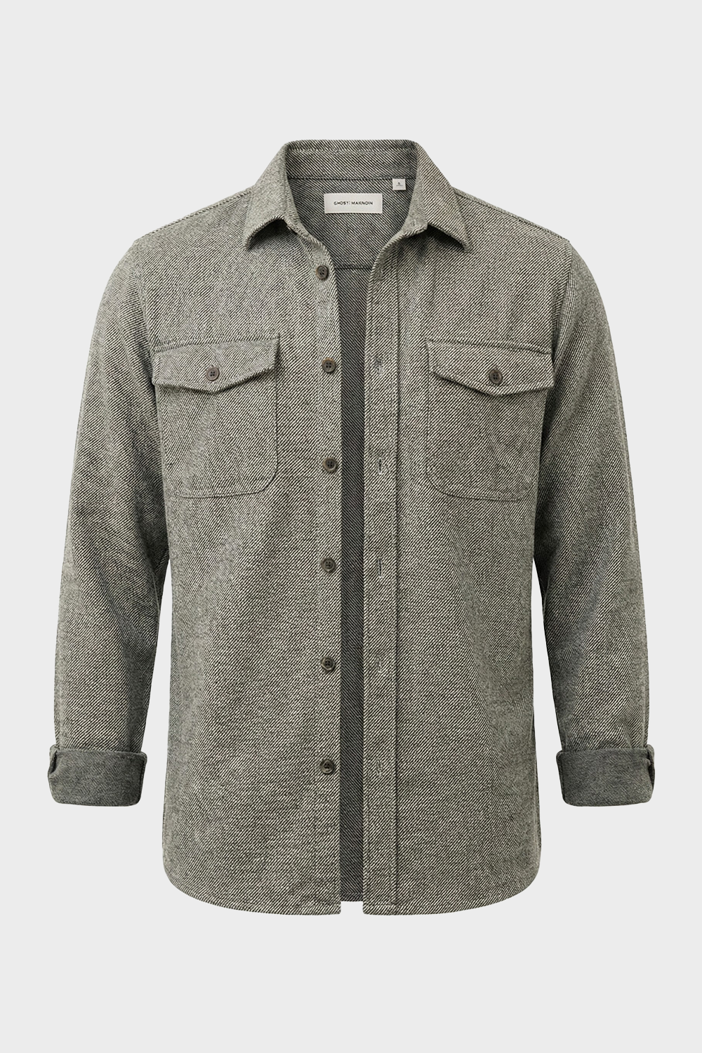 La chemise en tricot jersey à texture flanelle grise présente une coupe droite offrant un tombé naturel et confortable. Elle est dotée d’un col chemisier classique et d’une boutonnière pleine longueur pour un style polyvalent. Les manches longues se terminent par des poignets à revers en tissu contrastant avec ouverture boutonnée, ajoutant une touche raffinée. Deux poches appliquées à rabat à la poitrine apportent une allure utilitaire. L’ourlet légèrement arrondi et la petite étiquette à la couture latérale gauche, placée à 2 pouces de l’ourlet, complètent les détails soignés. Confectionnée dans un tissu doux et extensible, cette chemise combine confort et élégance décontractée.
