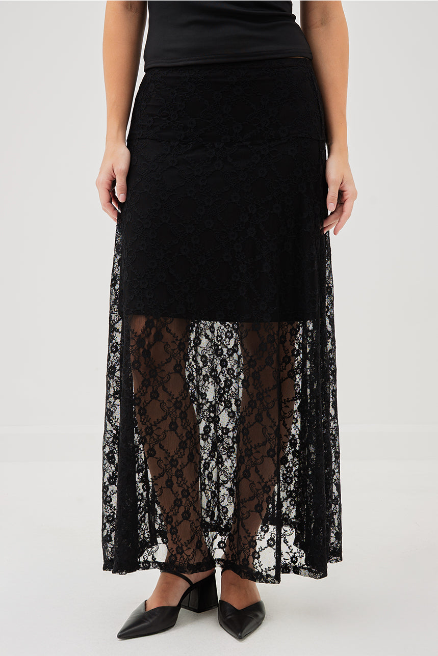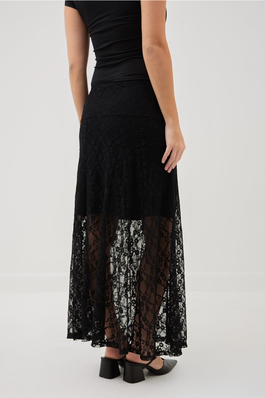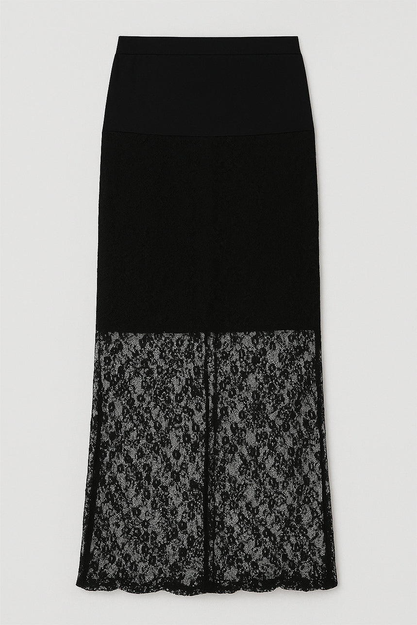 La jupe noire en dentelle Raschel adopte une coupe ligne A fluide et élégante. Dotée d’une taille régulière et d’une longueur maxi, elle est doublée jusqu’aux genoux pour un équilibre entre légèreté et confort. Sa matière extensible et confortable souligne la délicatesse de la dentelle tout en offrant une belle aisance de mouvement.