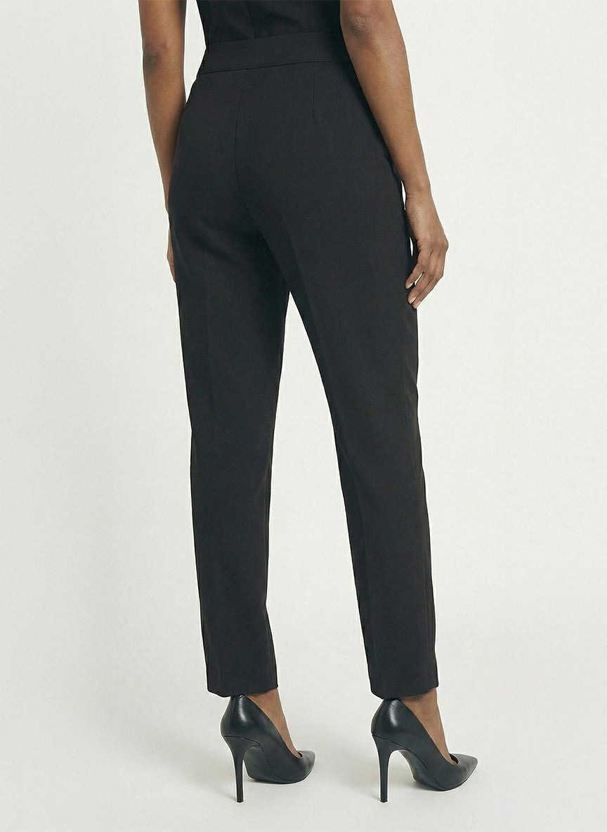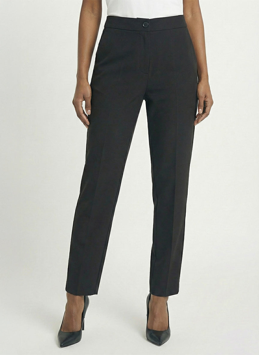 Ce pantalon taille haute offre une allure élégante grâce à sa coupe légèrement près de la jambe et ses finitions impeccables. Son avant est doté d’une ceinture invisible avec parementure, tandis que le dos présente une ceinture classique, complétée par des pinces surpiquées à l’avant et au dos pour un tombé net. Avec ses poches inclinées et sa fermeture à braguette avec bouton, il combine confort, structure et style au quotidien.