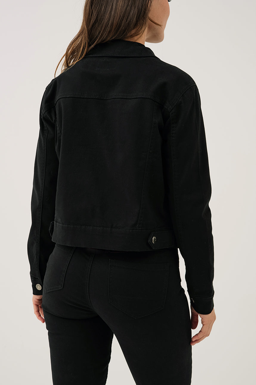 La veste en denim basique noir offre une coupe droite qui met en valeur la silhouette tout en restant confortable. Elle présente un col chemisier classique, des manches longues avec poignets boutonnés et une boutonnière pleine longueur pour un style épuré. Deux poches à rabat à la poitrine et deux poches Welt à l’avant ajoutent fonctionnalité et détails esthétiques. Confectionnée dans un denim doux et extensible, elle garantit un confort optimal et une liberté de mouvement, avec une longueur qui tombe élégamment aux hanches.