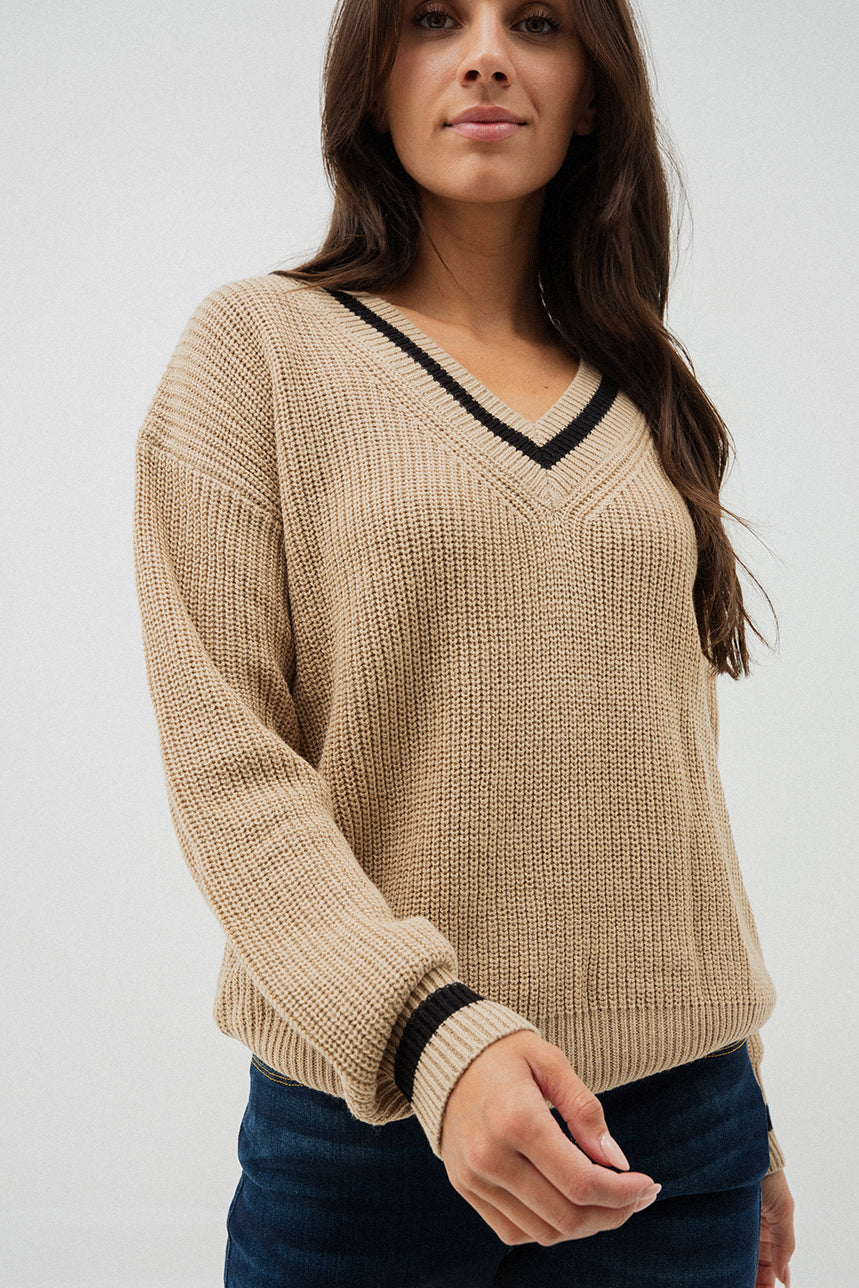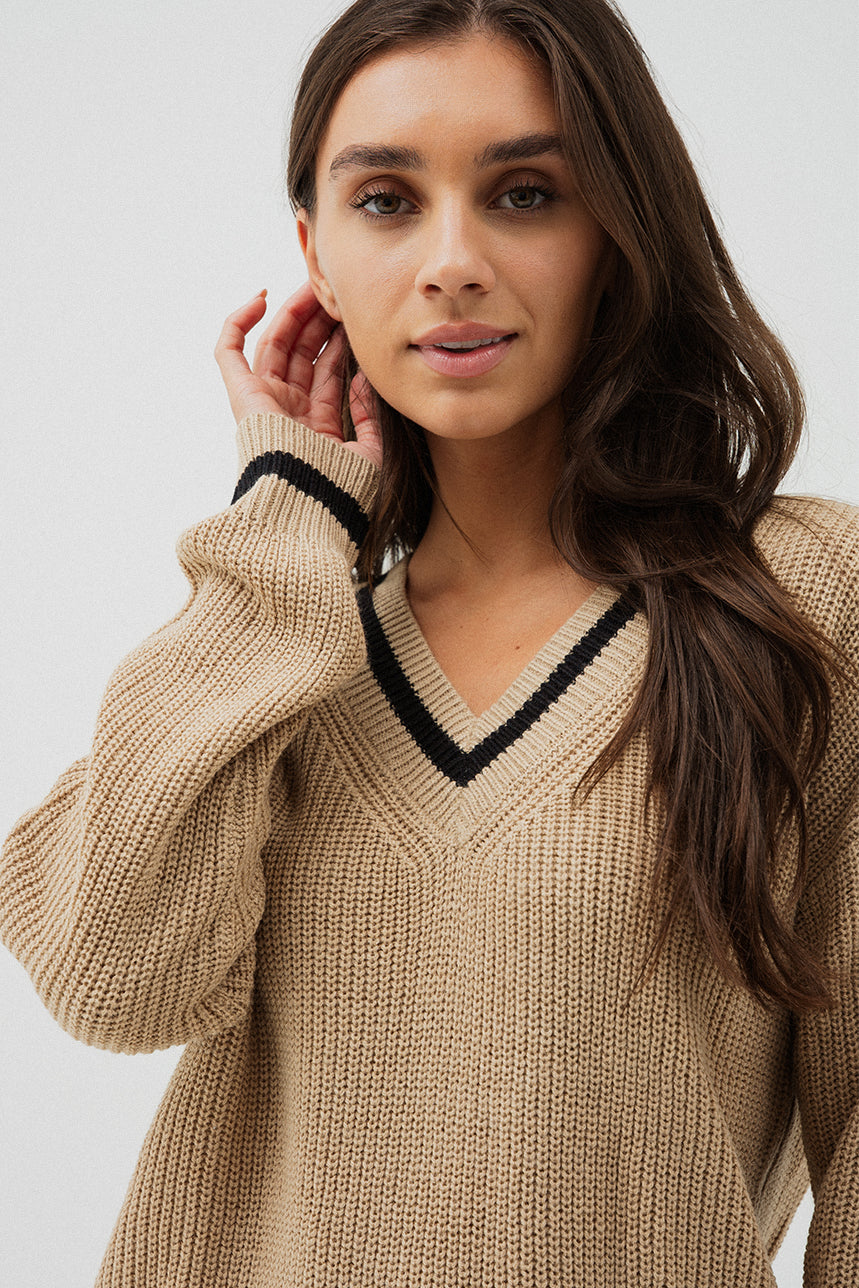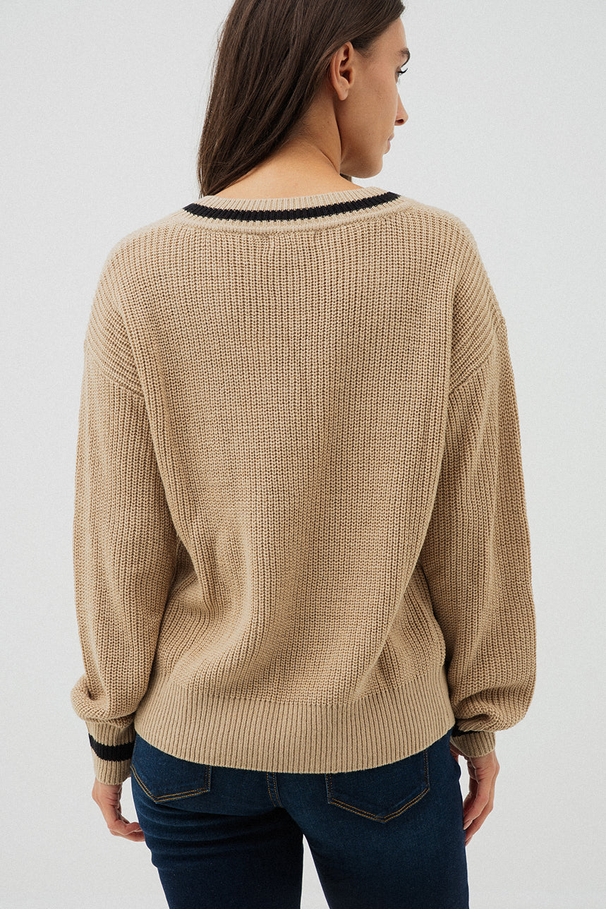 Le chandail en tricot camel et noir