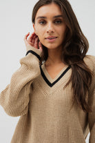 Ce chandail en tricot bicolore camel et noir mise sur un design ample pour un confort décontracté et tendance. Confectionné dans un tricot extensible et doux, il est doté d’un col en V flatteur, de manches longues et de bordures côtelées pour une finition soignée. Une pièce polyvalente, idéale pour rehausser vos looks du quotidien avec style et aisance.
