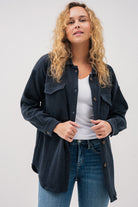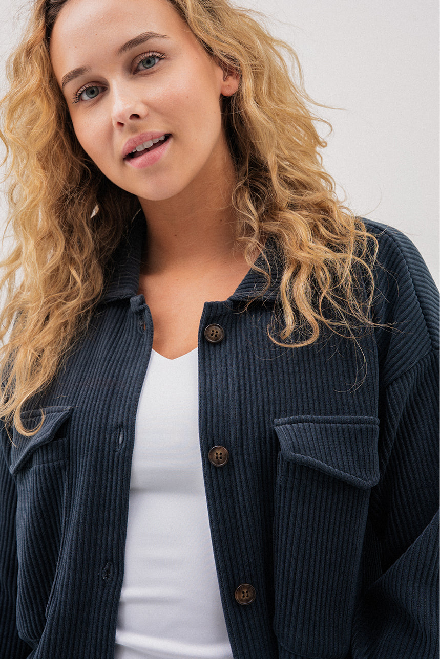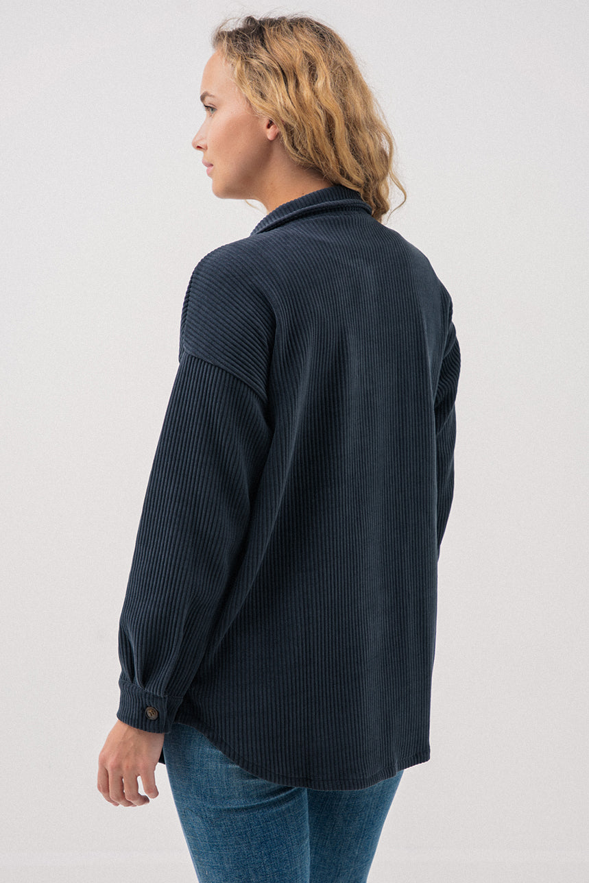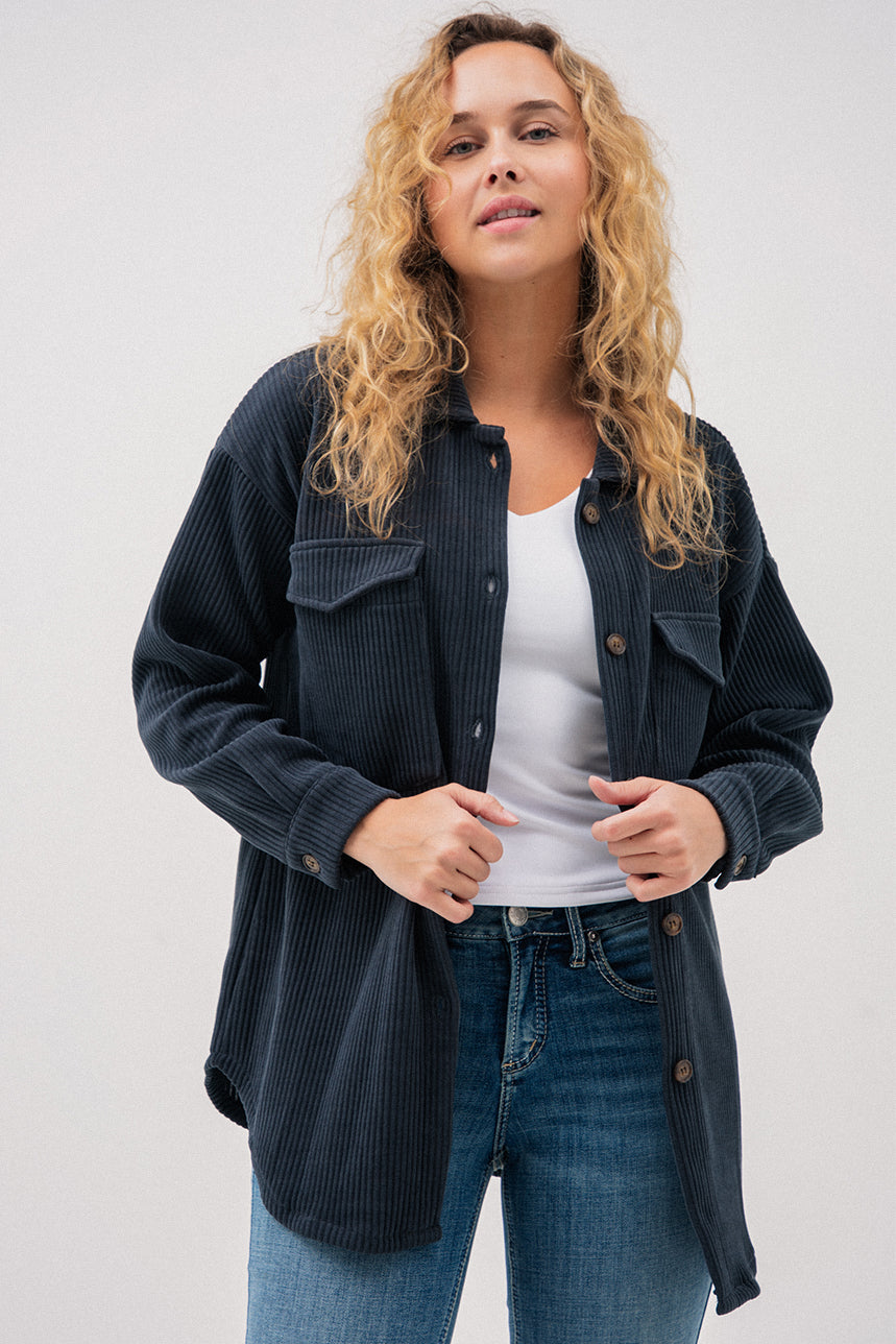 La sur-chemise en velours côtelé gris foncé adopte une coupe ample “Boyfriend” pour un style décontracté et tendance. Son col chemisier classique et sa boutonnière pleine longueur facilitent l’enfilage tout en apportant une allure structurée. Elle est agrémentée de deux poches appliquées avec rabats à la poitrine, idéales pour un look utilitaire et fonctionnel. Les manches longues, dotées de fentes et boutons aux poignets, ajoutent une finition soignée et permettent un ajustement personnalisé. Avec son ourlet arrondi et sa longueur mi-cuisse, cette surchemise est parfaite à porter seule ou en superposition pour un confort chaud et stylé lors des journées plus fraîches.
