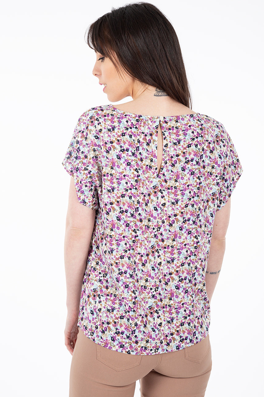 Blouse pour femme à manches courtes, de la marque B.Young. Motif de fleurs abstraites. Tissu super léger et fluide pour être confortable en tout temps. Ouverture au dos avec bouton. Agencez cette blouse colorée pour femme à votre jupe ou pantalon préféré pour un look de tous les jours impeccable.