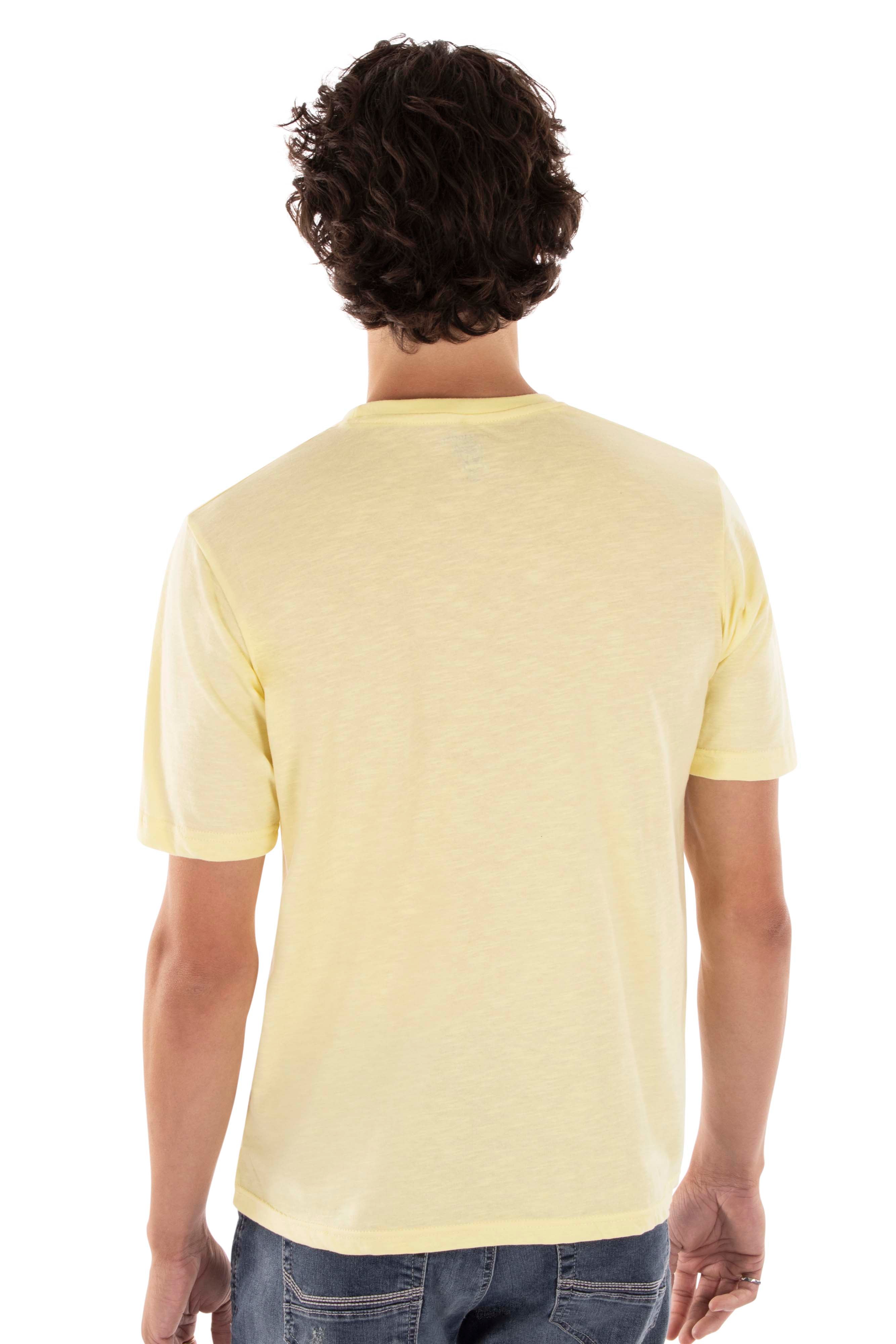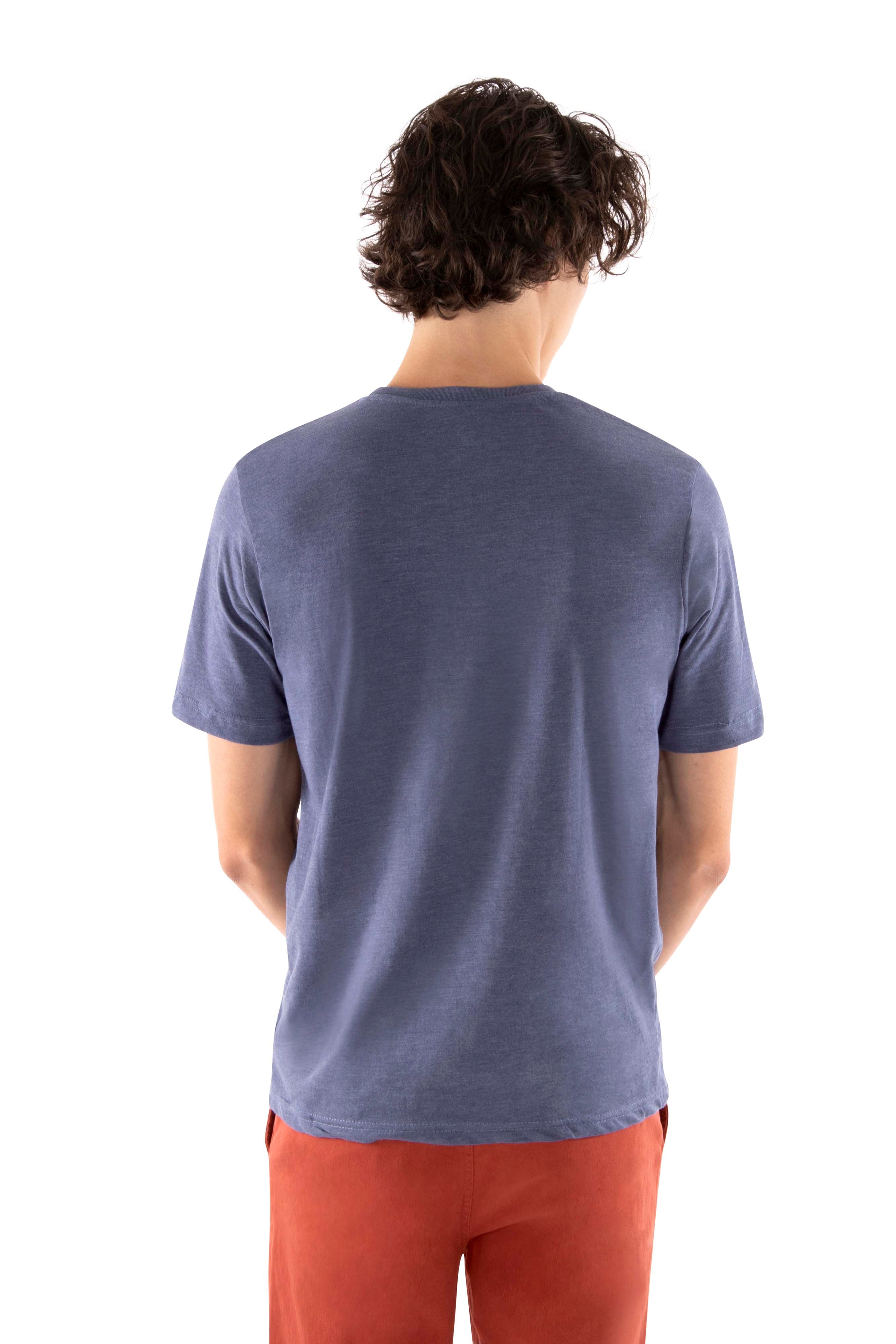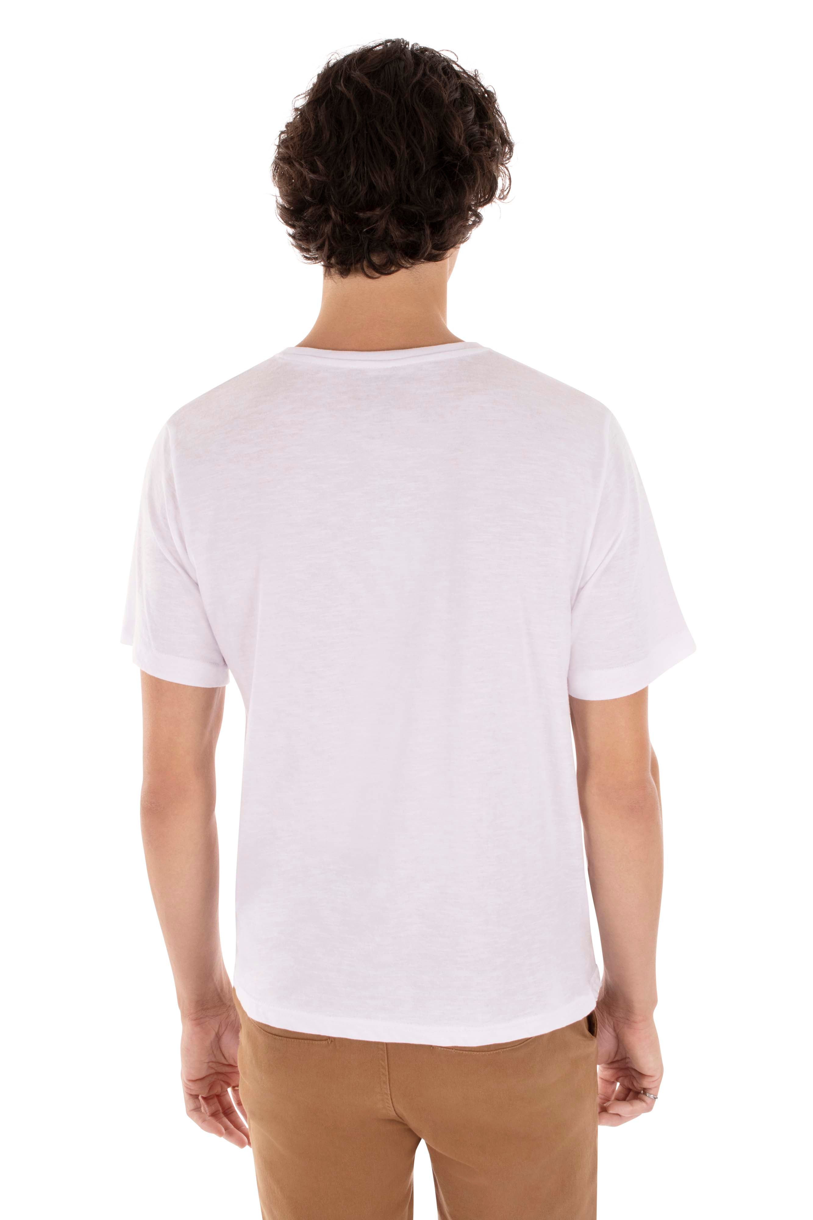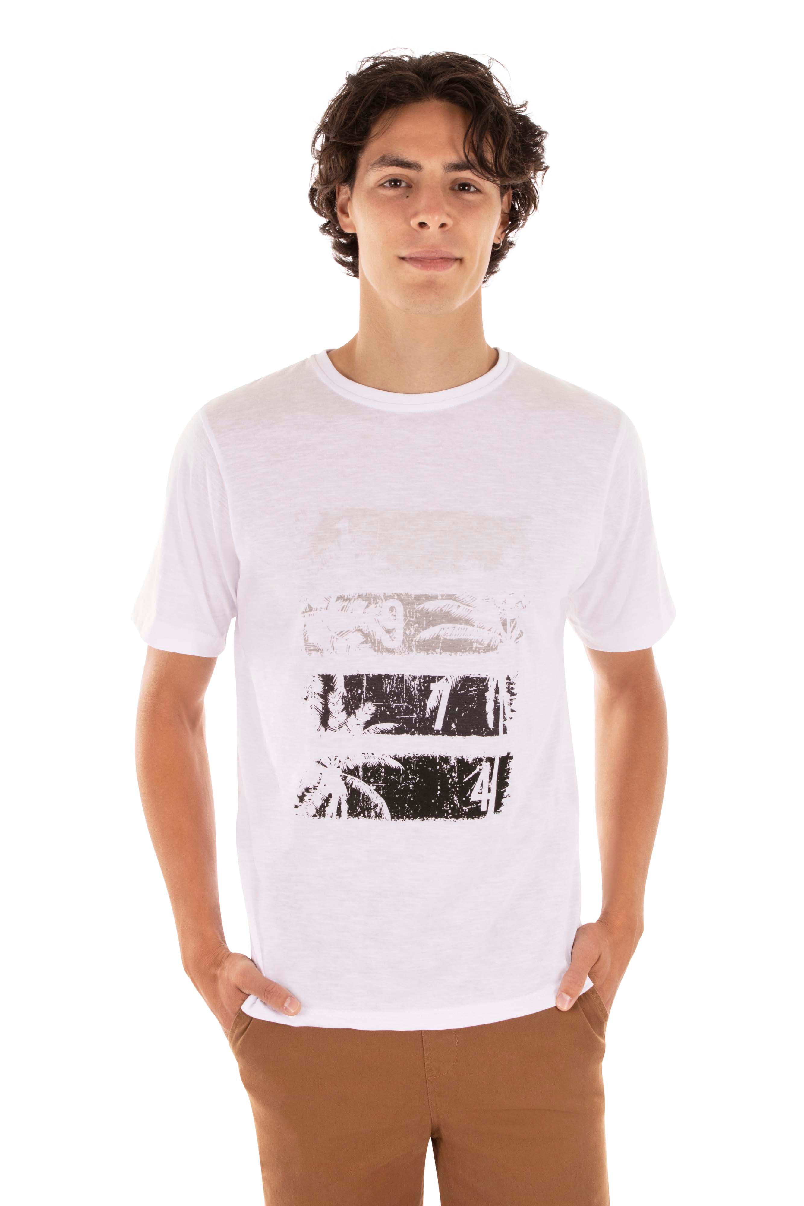 T-shirt col rond avec imprimé graphique de palmiers structuré en quatre bandes. Chiffres 1, 9, 7 et 4 insérés dans l'imprimé qui, une fois regroupés, forment l'année de fondation de Boutique Le Pentagone. Tissu doux, extensible et confortable.