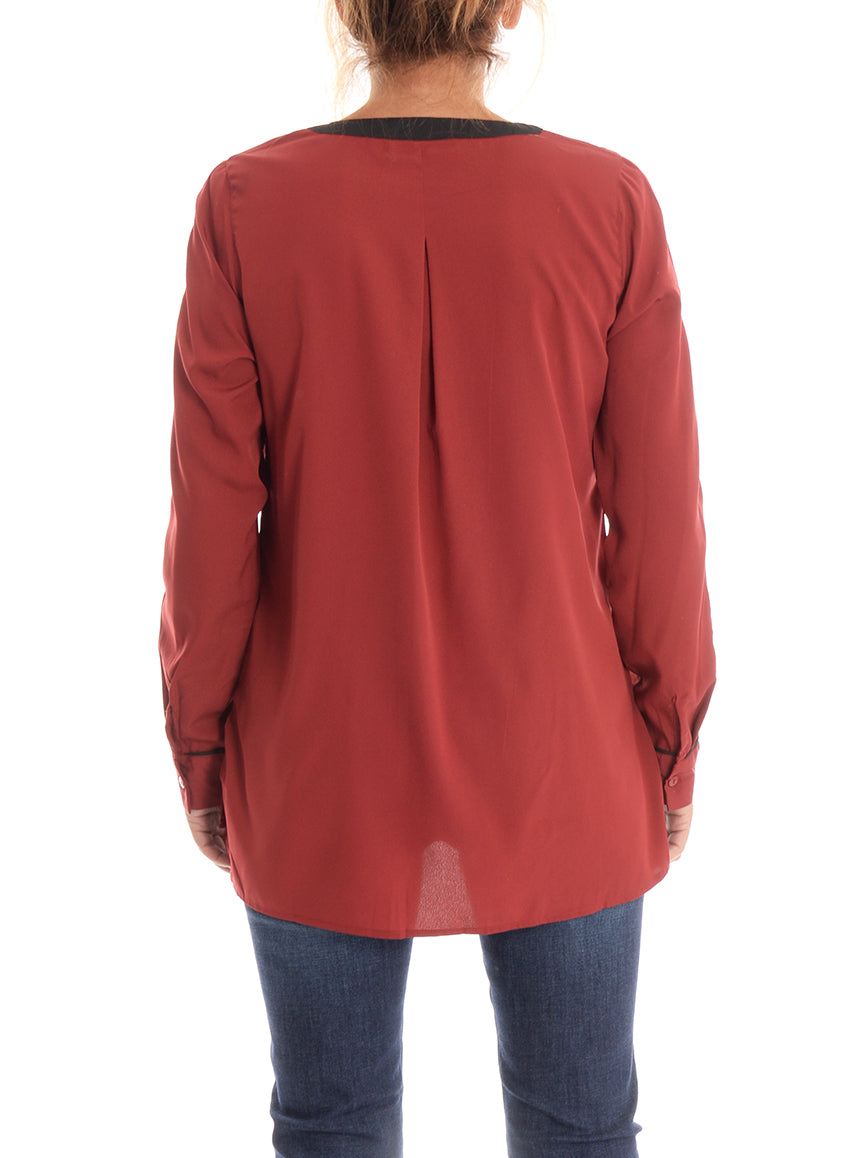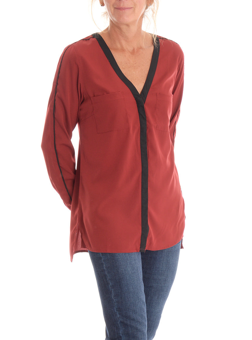 Blouse Pentagone fluide à manches longues. Bandes contrastantes au col, au devant et aux manches