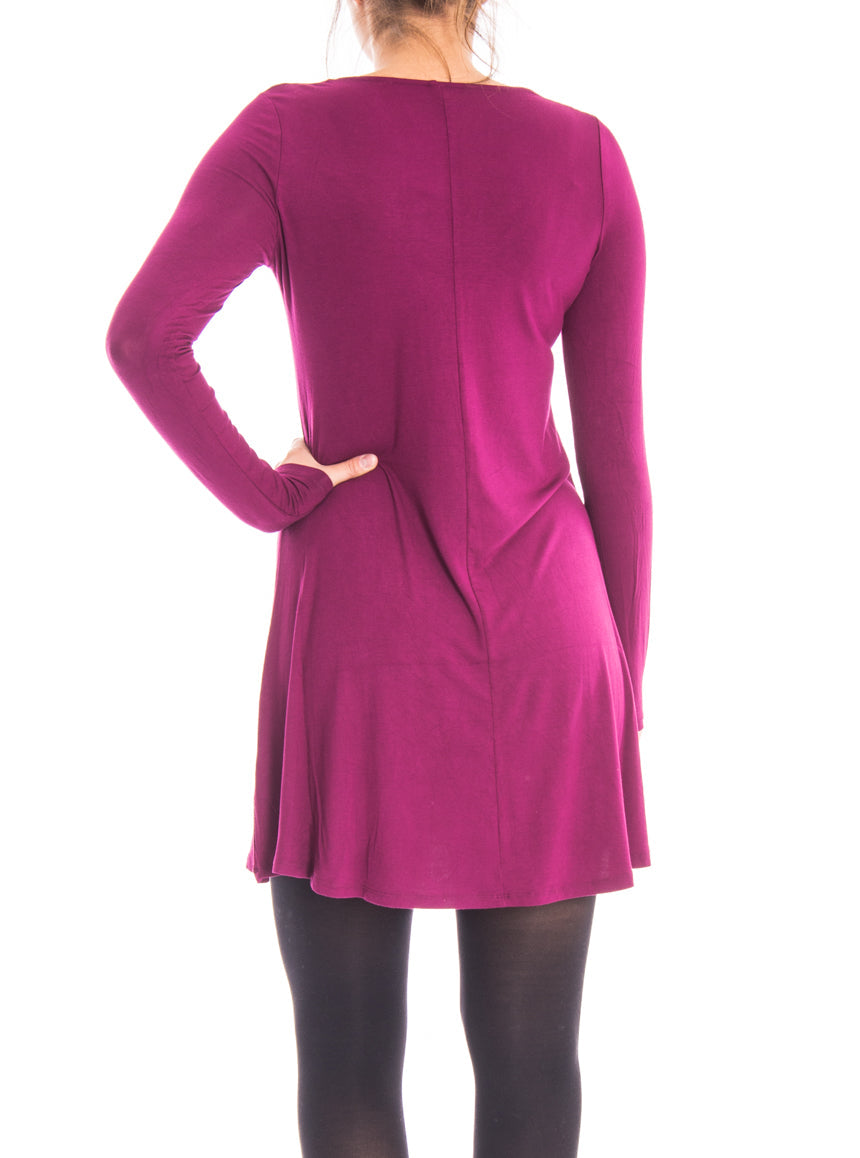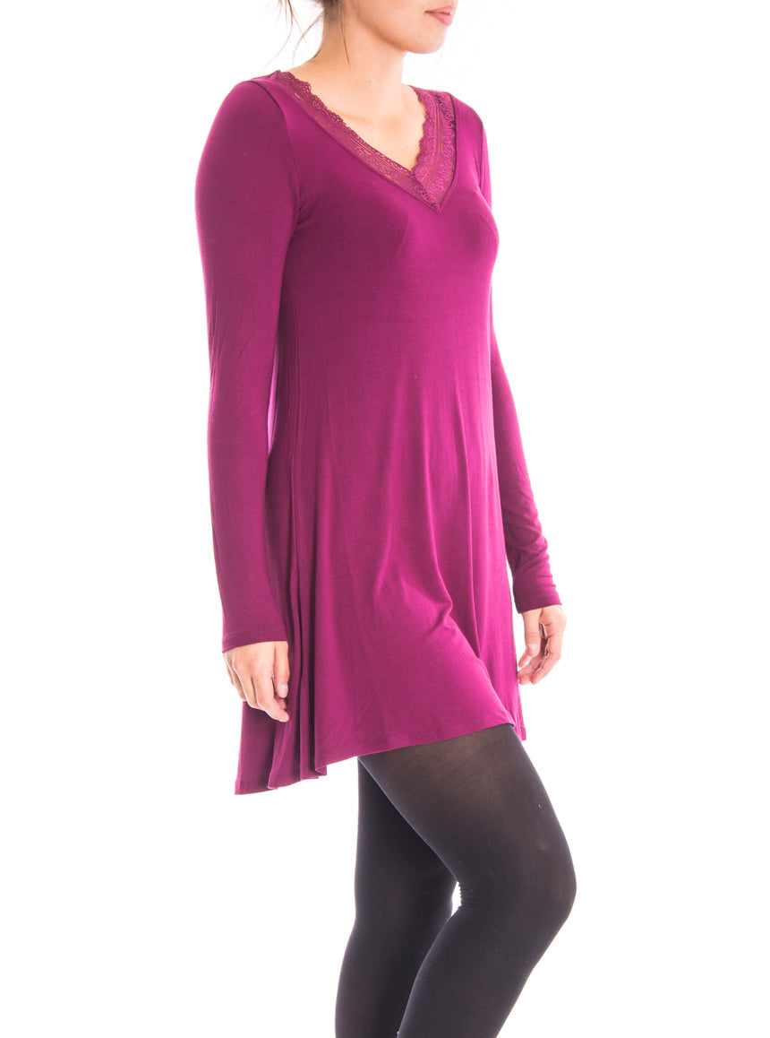 Petite robe fluide Pentagone à manches longues et col en V. Détail de dentelle à l'encolure.