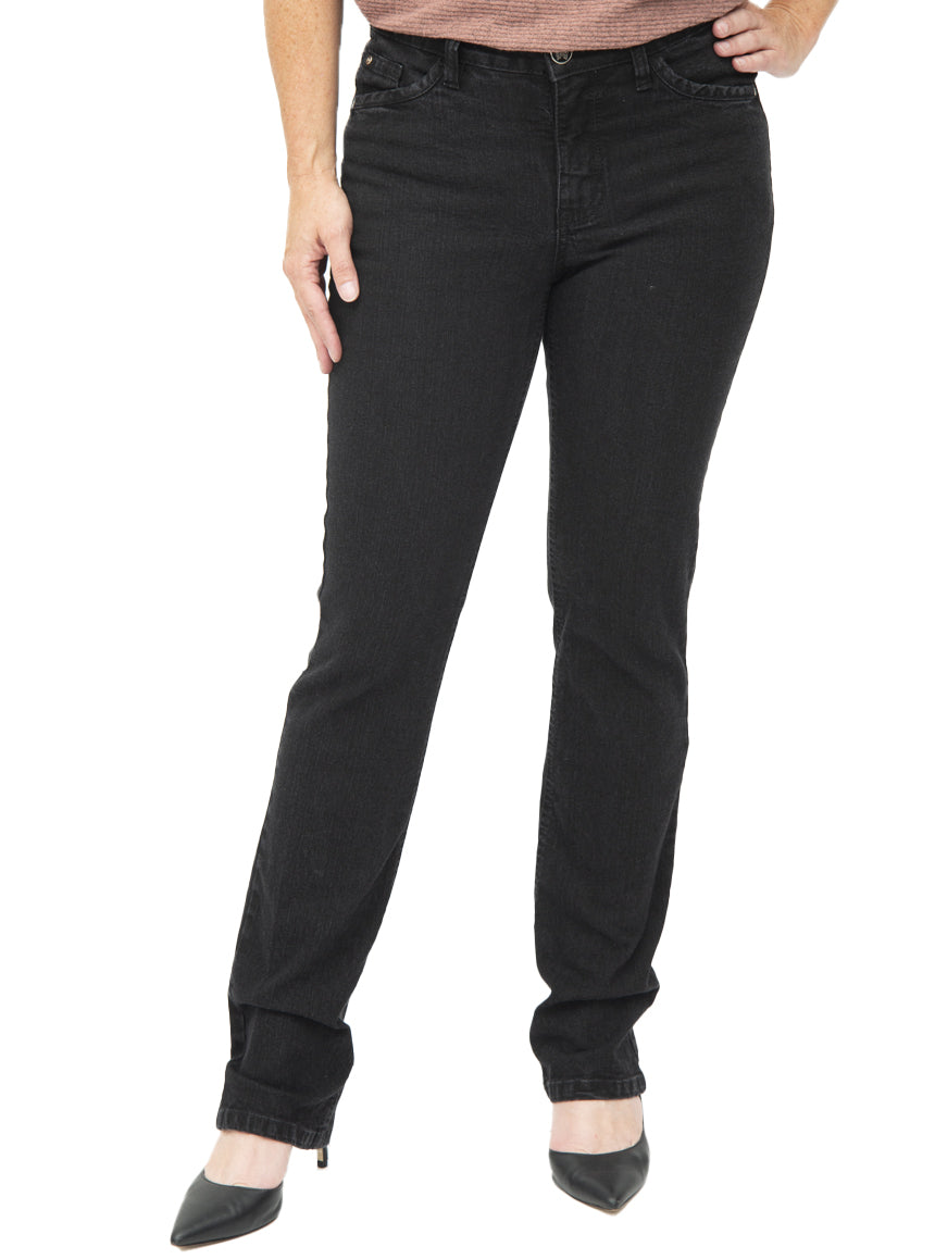 Coupe de jeans Pentagone à jambe droite. Le jeans noir idéal pour la femme qui désire un denim confortable tout en valorisant sa silhouette. S'agence très bien avec tous les hauts.