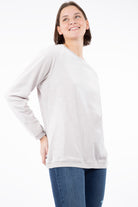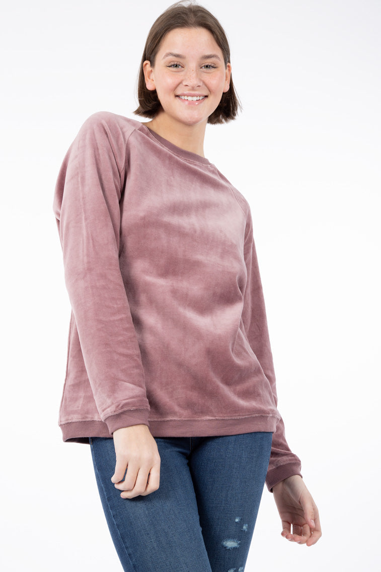 Chandail détente col rond en velours pour femme. Bordures côtelées au col, aux poignets et à la base. Tissu léger et extensible. Disponible en 4 couleurs. Soyez confortable et stylé toute la journée avec ce chandail ample pour femme.