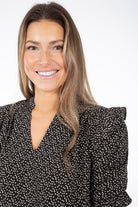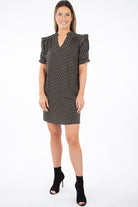 Robe à manches courtes pour femme, de la collection Pentagone Premium. Joli imprimé de petites fleurs blanches. Col rond avec fente. Volant aux épaules. Osez la robe ample pour femme. Portez-la avec une ceinture pour la cintrer ou laisser la lousse pour un look contemporain.