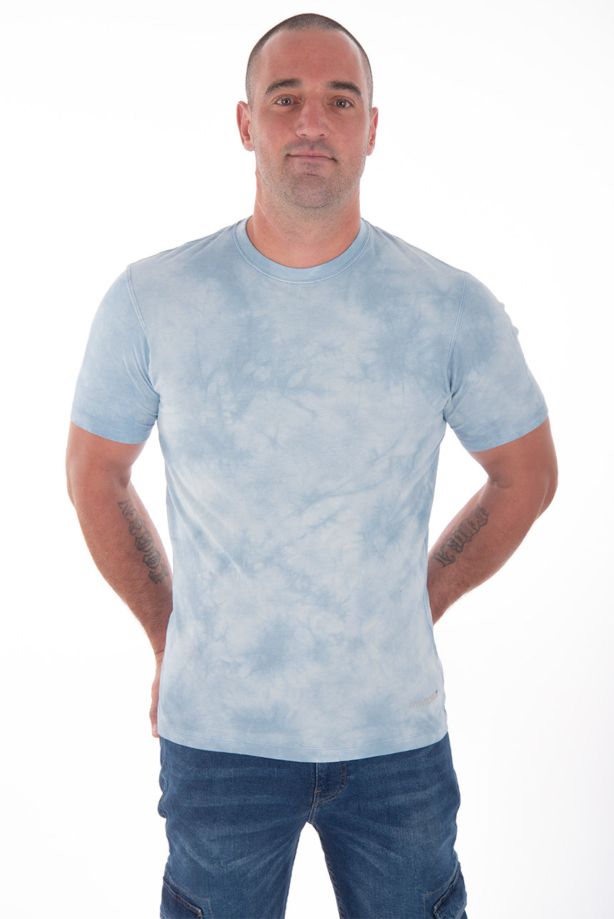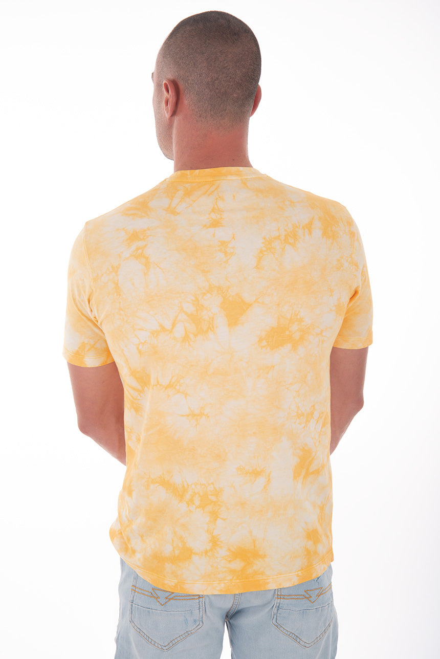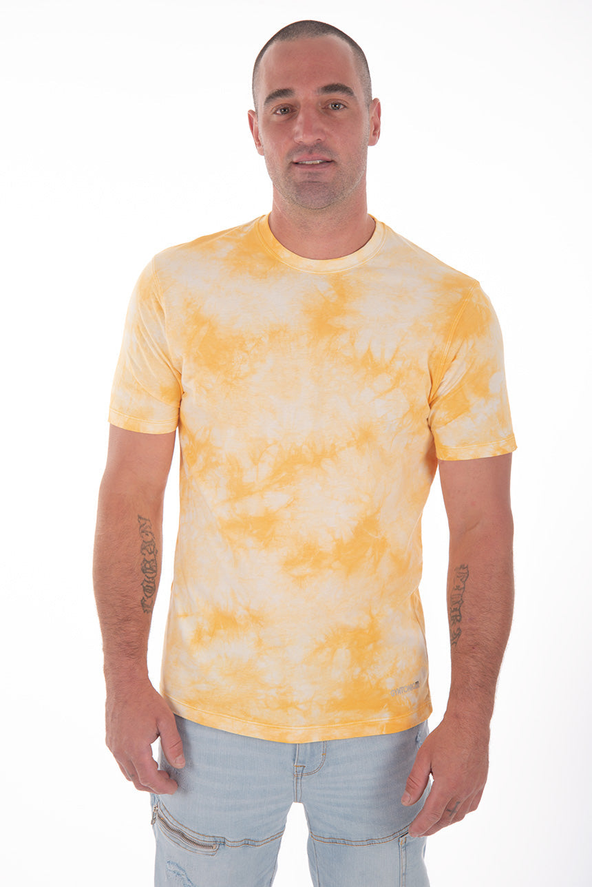 T-shirt col rond avec motif tie-dye de couleur blanc, jaune et orangé. Collection GYMTONIQ pour homme avec petit logo texturé au bas. Tissu doux, extensible et confortable. On aime les couleurs vibrantes et le look original de ce t-shirt pour homme qui lui donnent un petit punch coloré.