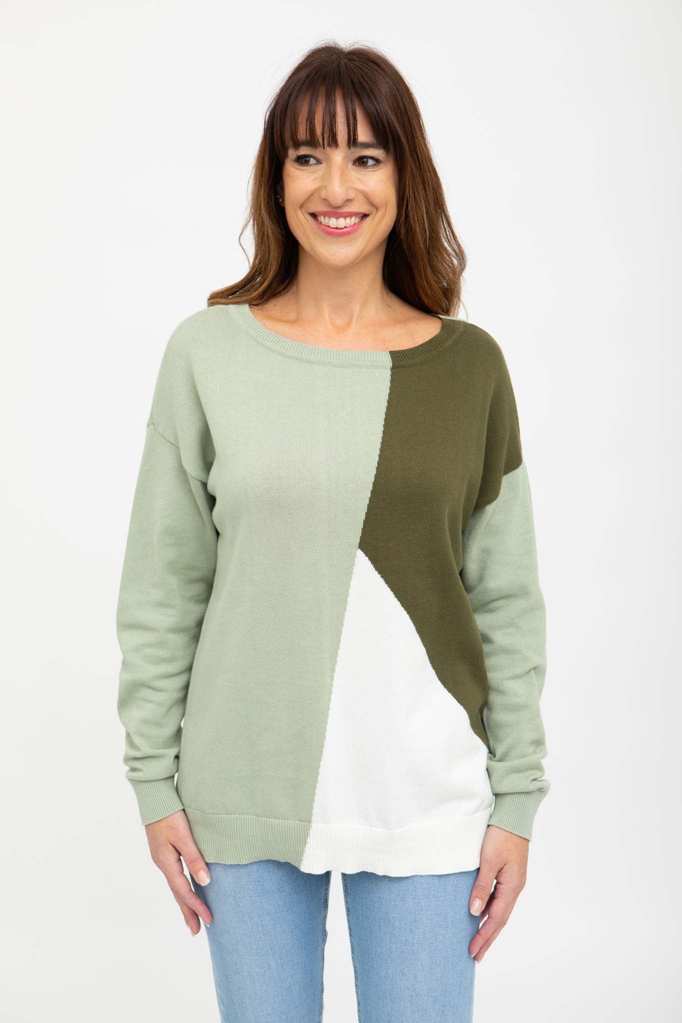 Chandail en tricot à motif géométrique trois couleurs de la marque Fransa. Bordures côtelées. En plus d'ajouter une belle touche de couleur à vos ensembles, ce chandail pour femme vous apportera confort et style.