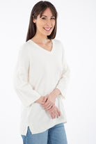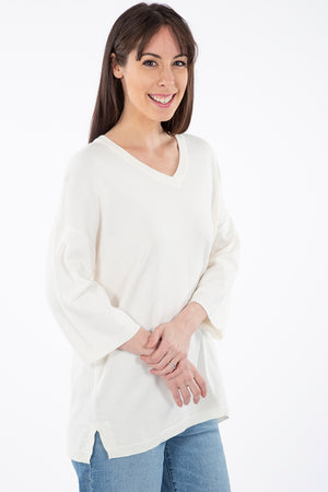 Chandail tunique manches 3/4 pour femme, de la marque Fransa. Col V. Tricot côtelé aux extrémités. Tissu doux et très extensible. Disponible en 2 couleurs. Cette tunique pour femme se mariera parfaitement à vos leggings, jeans ou pantalons préférés.