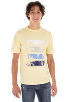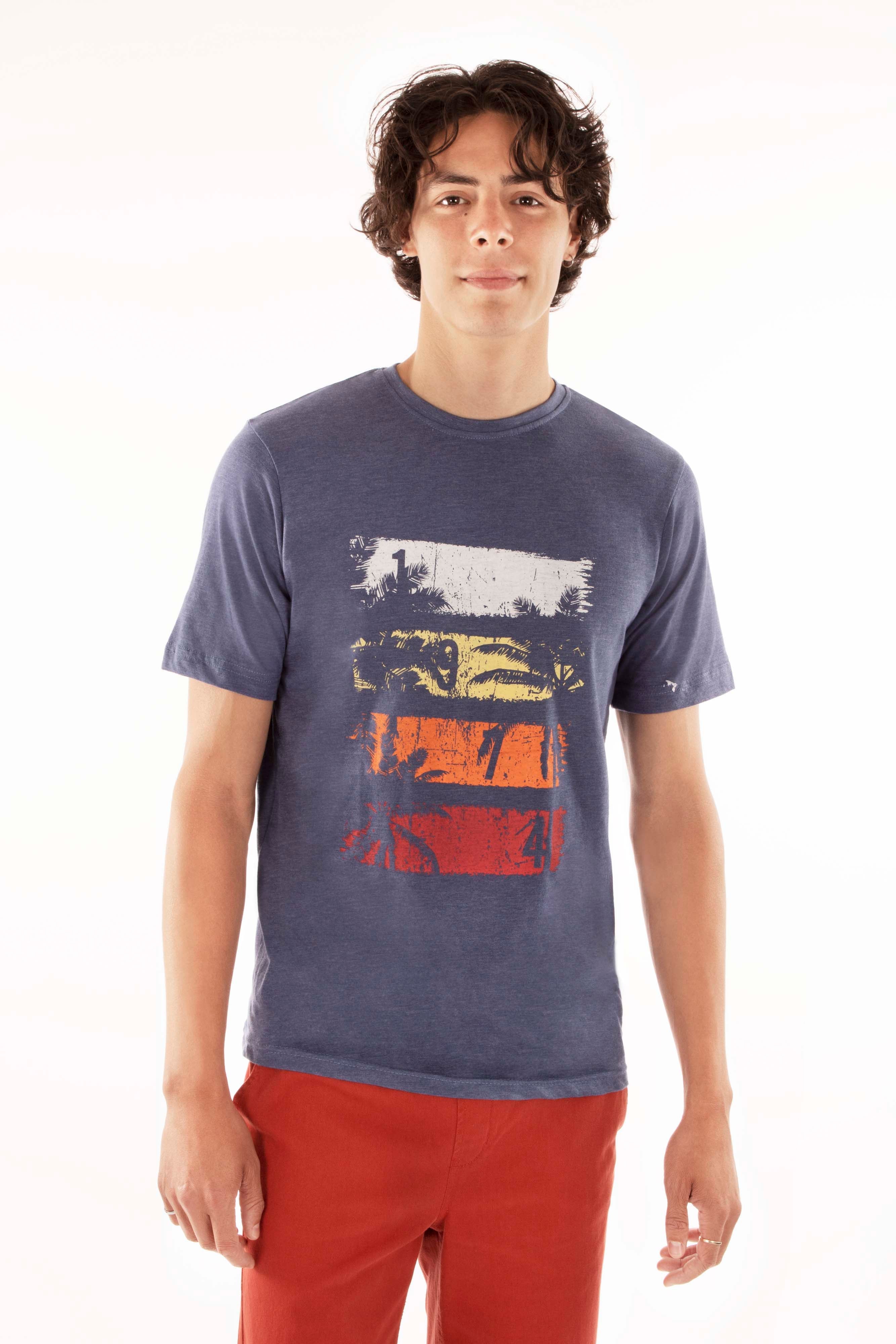 T-shirt col rond avec imprimé graphique de palmiers structuré en quatre bandes. Chiffres 1, 9, 7 et 4 insérés dans l'imprimé qui, une fois regroupés, forment l'année de fondation de Boutique Le Pentagone. Tissu doux, extensible et confortable.
