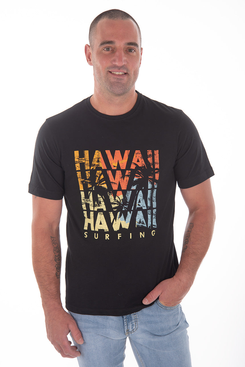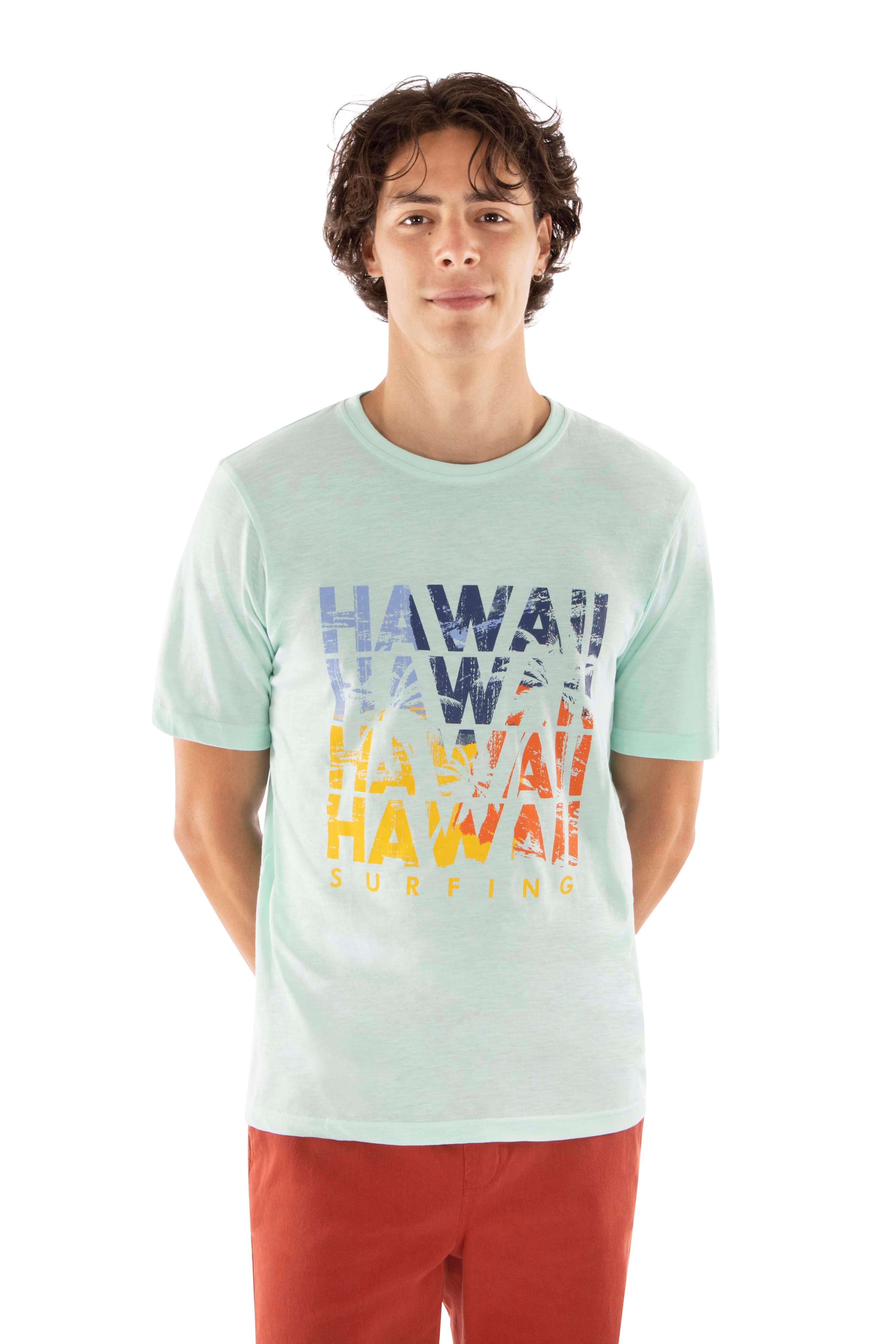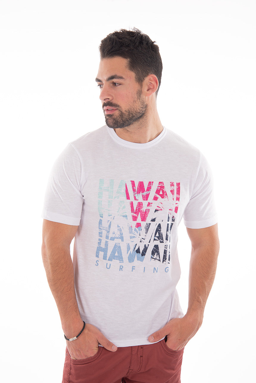 T-shirt col rond avec imprimé graphique représentant l’inscription « Hawaii Surfing ». Tissu doux, extensible et confortable. On aime les couleurs vibrantes de ce t-shirt pour homme qui lui donnent un petit punch coloré.