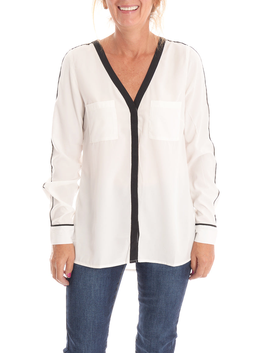 Blouse Pentagone fluide à manches longues. Bandes contrastantes au col, au devant et aux manches